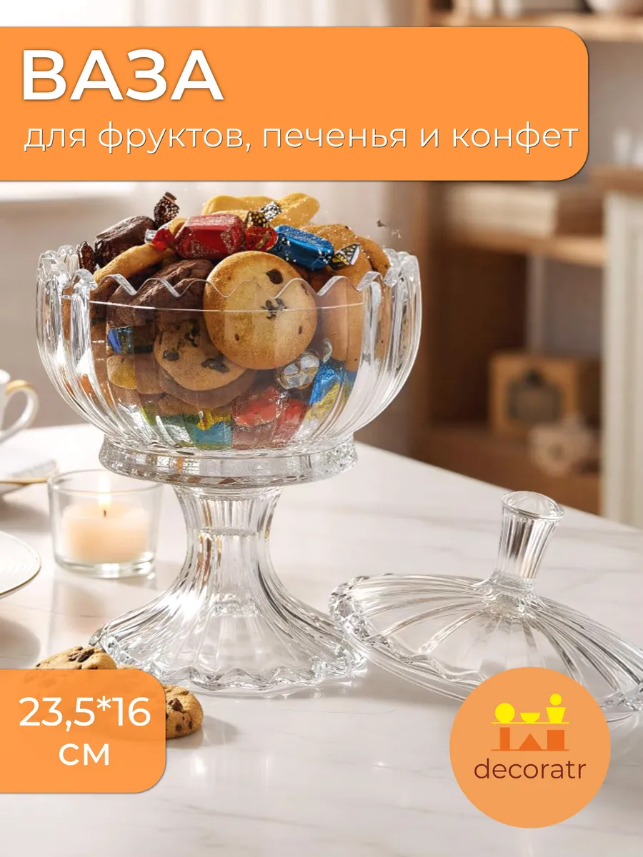Эта изящная ваза для конфет и печенья станет настоящим украшением вашего дома. Прозрачное стекло позволяет увидеть всю красоту содержимого – яркие фрукты, аппетитные конфеты, хрустящее печенье.