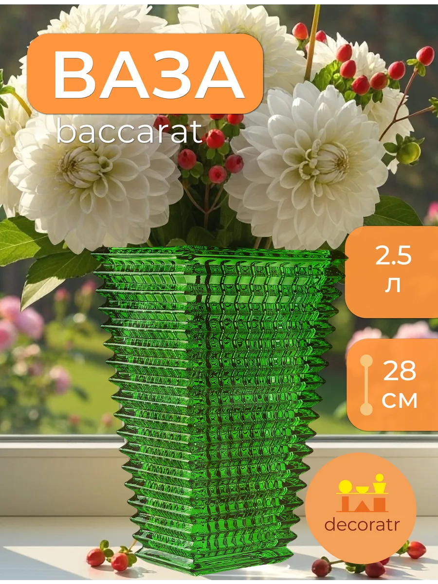 Ваза стеклянная Баккарат зеленая, высокая и большая, высота Baccarat 28 см, настольная, глянцевая и прозрачная, ребристая, с геометрическим декором. При ручном выдуве стекла возможно наличие вкрапления пузырьков воздуха.