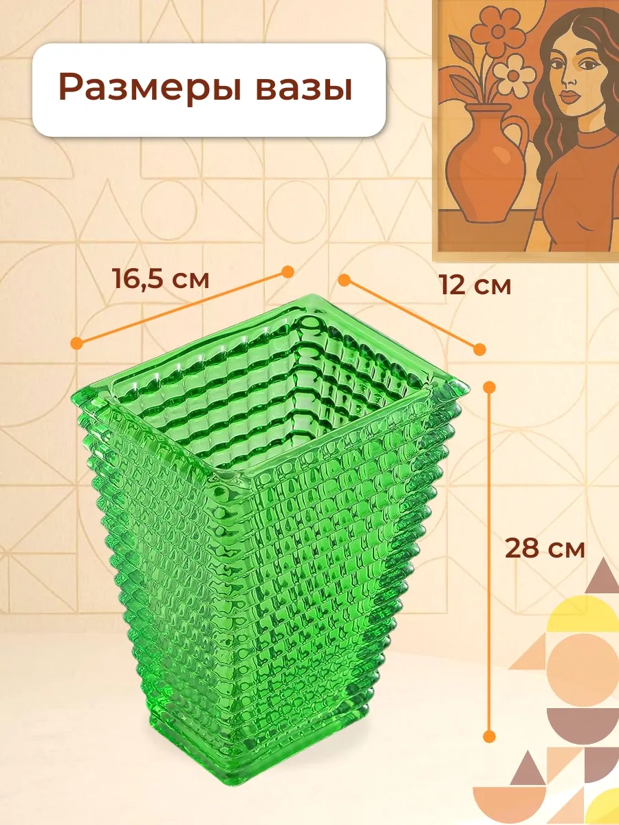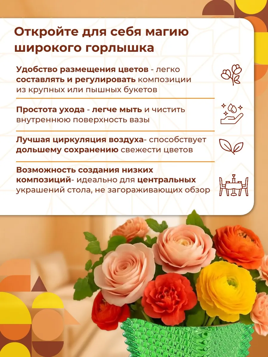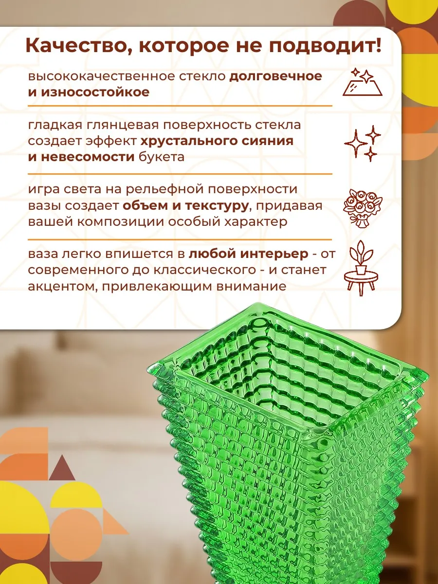 Прикоснитесь к рельефной поверхности с сотнями граней. Каждая создаёт игру света, напоминающую драгоценный изумруд. Ваза для роз высокая идеально подчёркивает красоту длинных стеблей, а декоративная ваза без цветов становится самостоятельным арт-объектом.