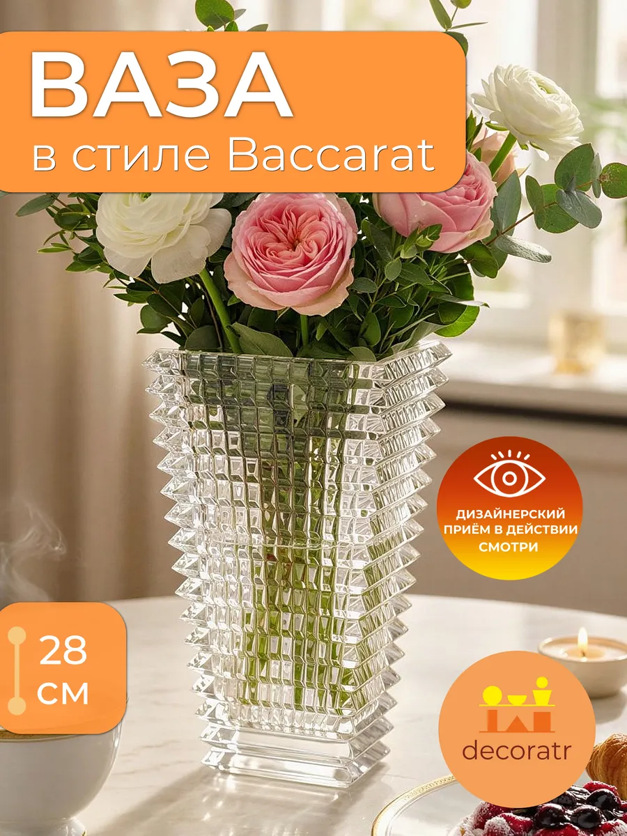 Почувствуйте благородную тяжесть прочного толстого стекла высотой 28 см. Эта ваза Бакарат большая создана с безупречным качеством — каждое изделие уникально!