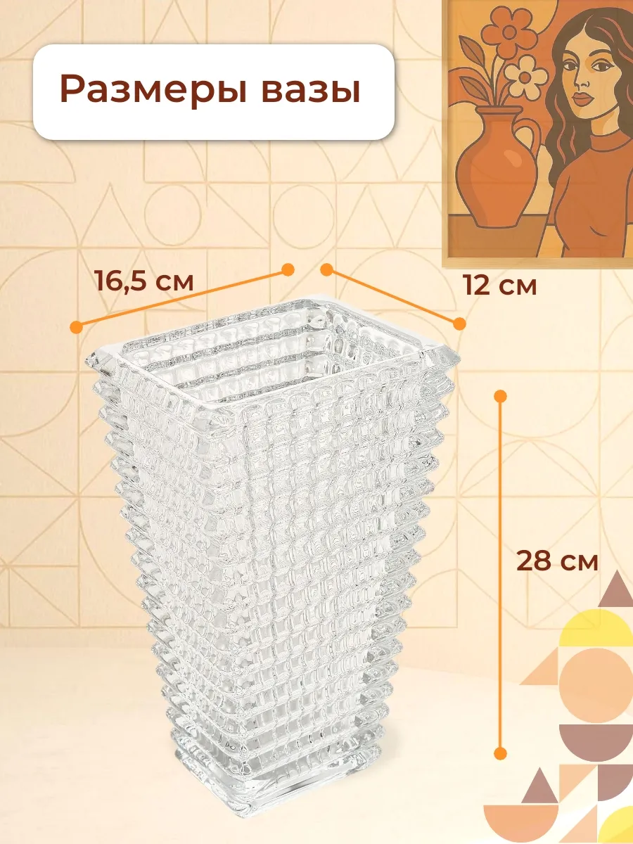 Ваза стеклянная Баккарат квадратная стекло, высокая и большая, высота 28 см, настольная, глянцевая и прозрачная, рифленая, с геометрическим декором. Ваза стеклянная Баккарат прозрачная для цветов высокая 28 см! Представьте себе магию французского мастерства в ваших руках! Ваза «Хрустальная Симфония» из коллекции в стиле Baccarat Eye — это не просто предмет декора, а настоящее произведение искусства,…