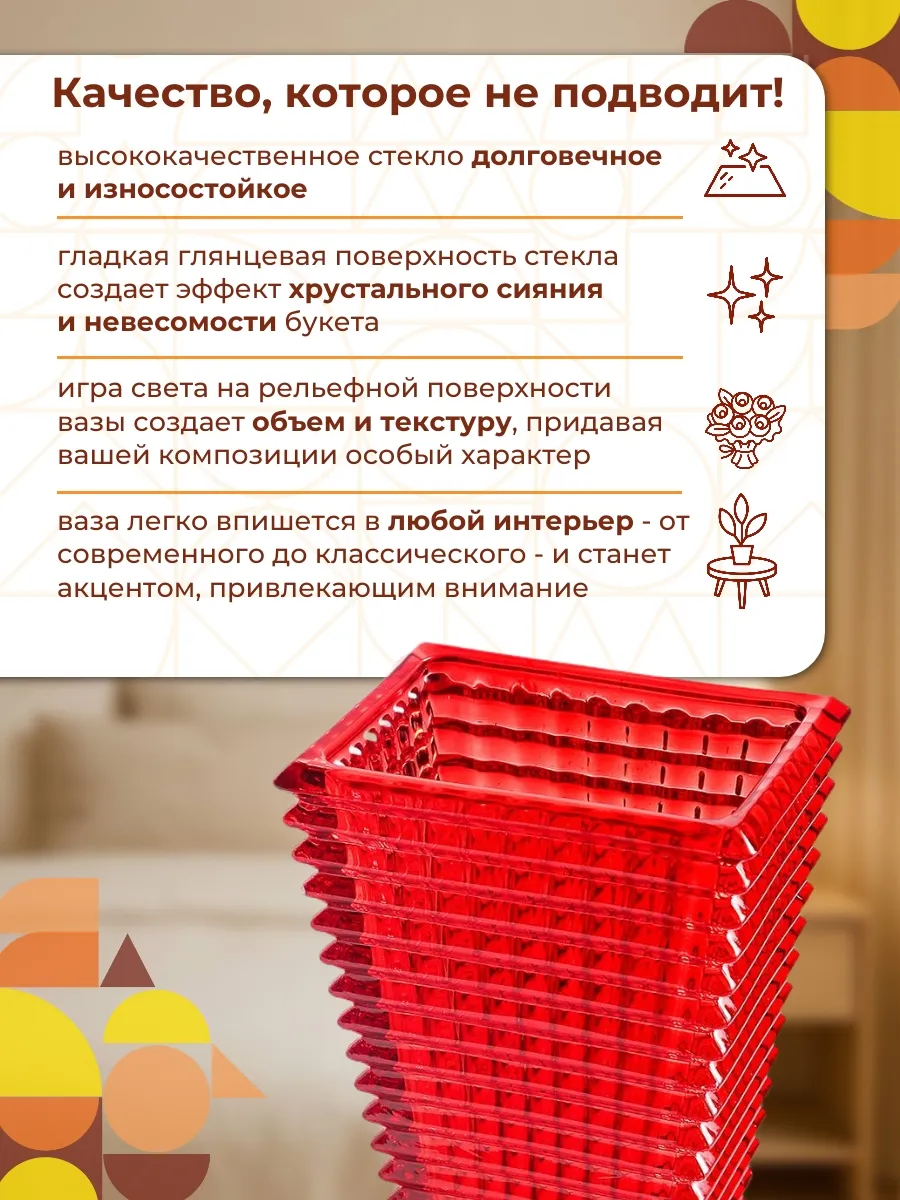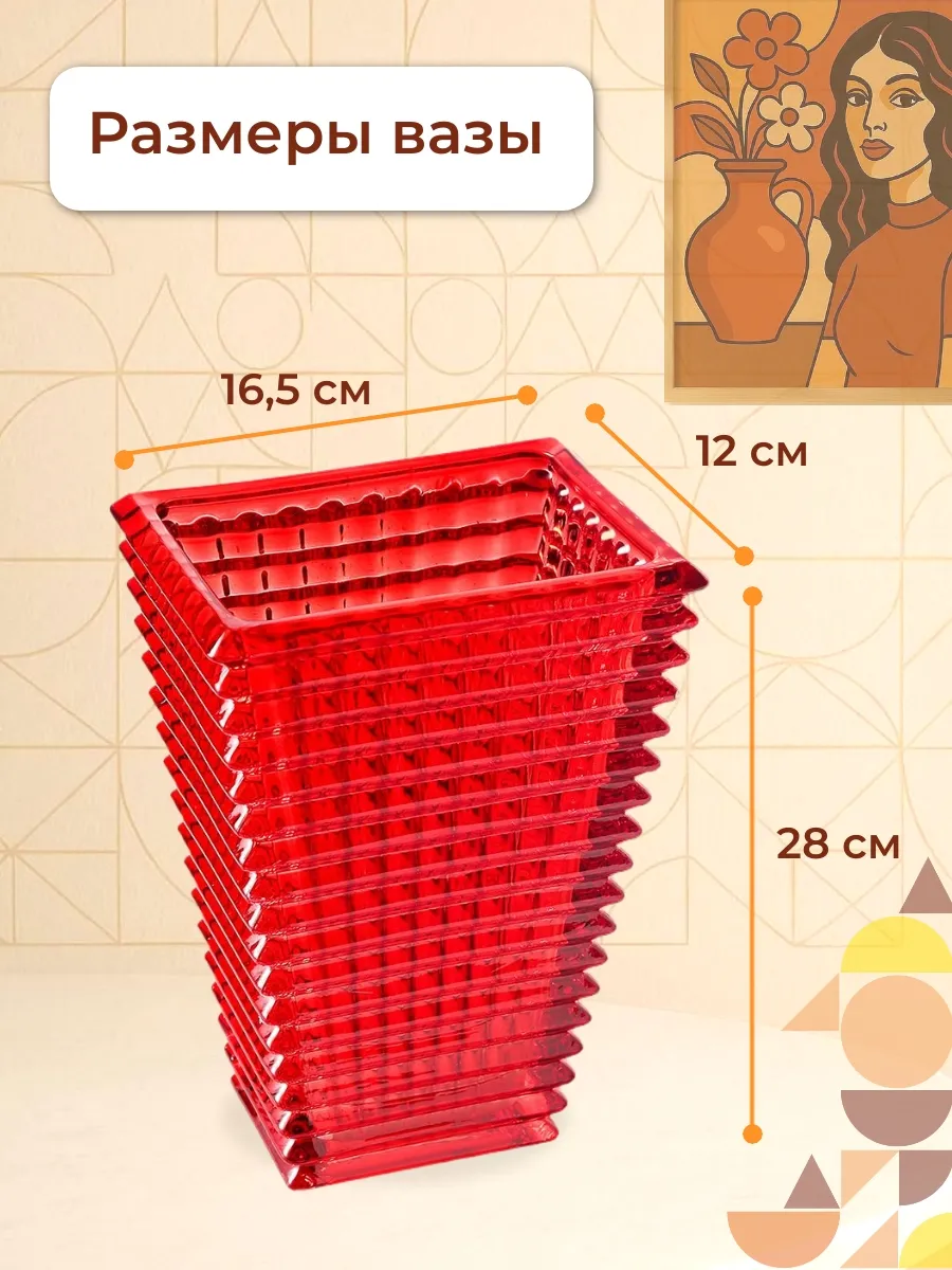 Ваза стеклянная Баккарат красная, высокая и большая, высота Baccarat 28 см, настольная, глянцевая и прозрачная, ребристая, с геометрическим декором. При ручном выдуве стекла возможно наличие вкрапления пузырьков воздуха.