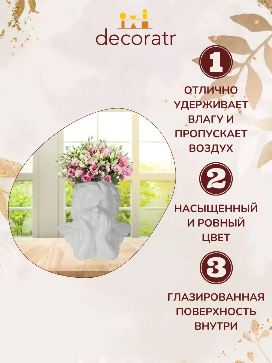 Эта интерьерная ваза идеально подходит для небольших букетиков роз, тюльпанов, фрезий или веточек сухоцветов. Представьте, как нежные цветы в руках ангела превращают обычный уголок в священное место красоты и гармонии! Размер 18,5 см делает её универсальной для любого пространства — от прикроватной тумбочки до журнального столика.