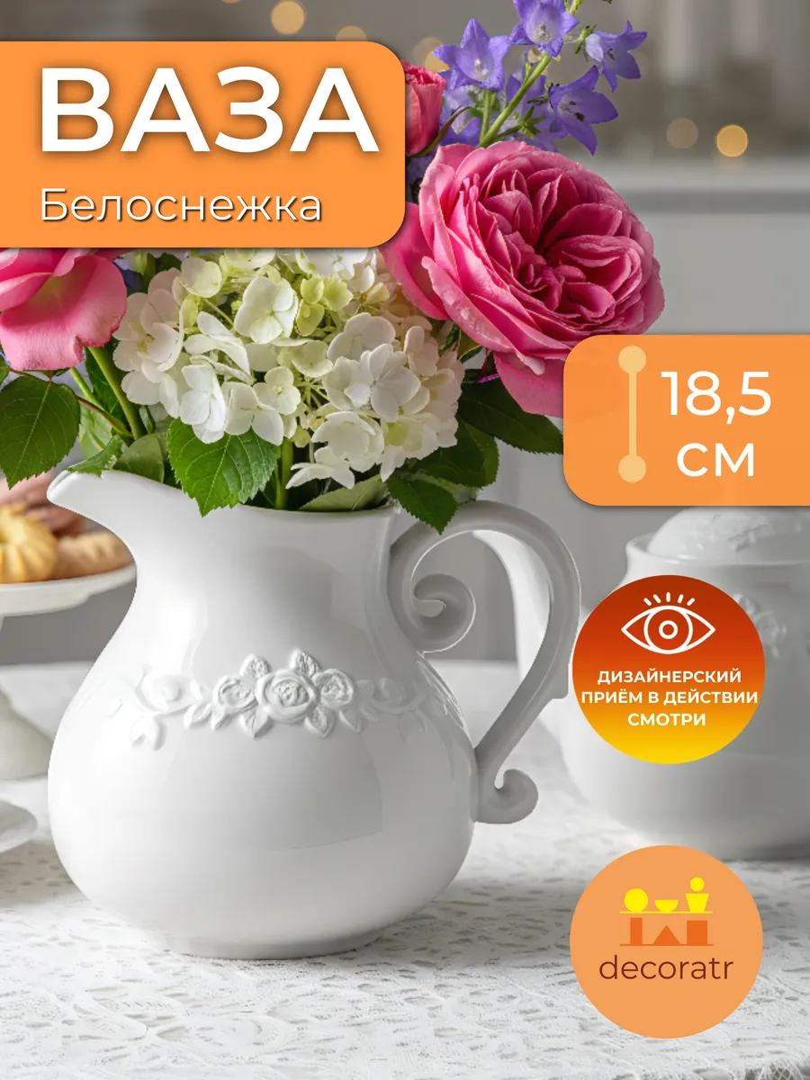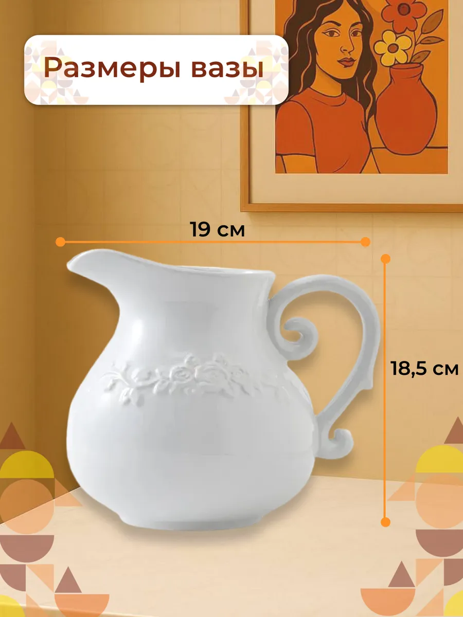 Представьте себе утро, когда солнечные лучи касаются белоснежной поверхности этой изящной вазы высотой 18,5 см, и весь дом словно наполняется светом и гармонией! Ваза «Нежность» — керамическая интерьерная ваза для цветов в классическом стиле кувшина с элегантной фигурной ручкой и деликатным цветочным рельефом.
