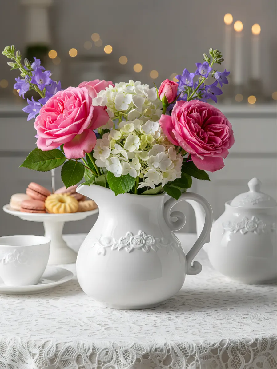 Ассоциации: Французский молочник; античный кувшин; винтажная посуда из бабушкиного сервиза; керамика прованских мастерских; белоснежный фарфор королевских сервизов; деревенская утварь из французской провинции; изящный чайник без крышки
