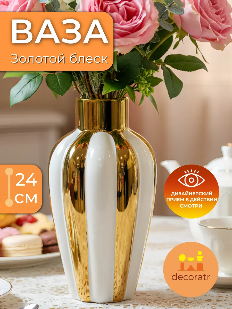 Представьте, как солнечные лучи отражаются от золотистых полос этой изящной керамической вазы высотой 24 см, создавая в вашем доме атмосферу настоящего дворца! Ваза «Золотой блеск» — это не просто интерьерная ваза для цветов, это произведение искусства, которое мгновенно преображает любое пространство.