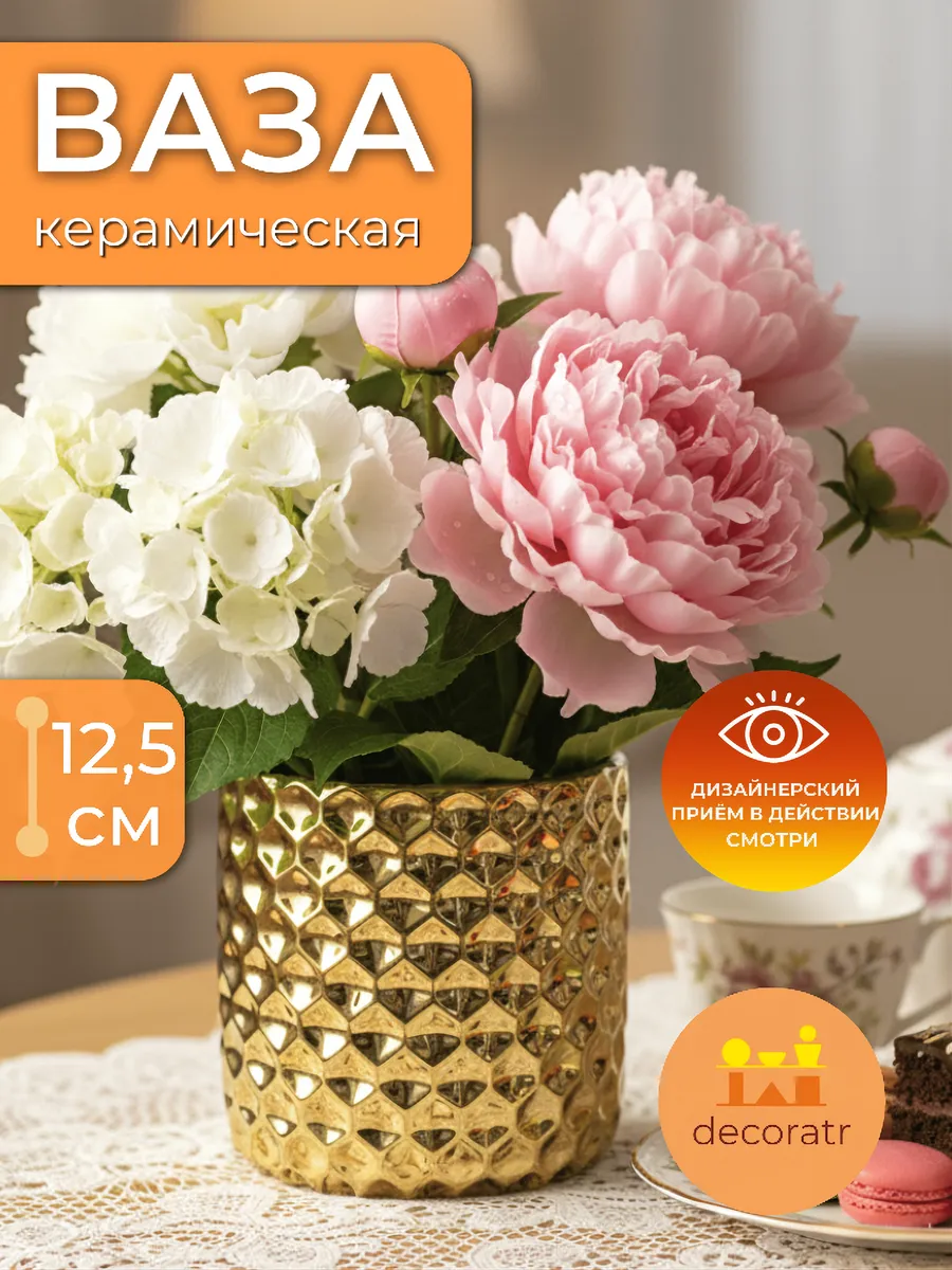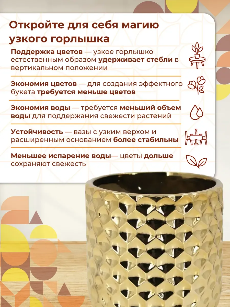Представьте: солнечные лучи играют на золотистой поверхности, а каждая грань отражает свет, словно драгоценный камень! Ваза «Золотой мёд» высотой 12,5 см — это не просто керамическая ваза для цветов, а настоящее произведение искусства, которое превратит любой уголок в оазис роскоши.