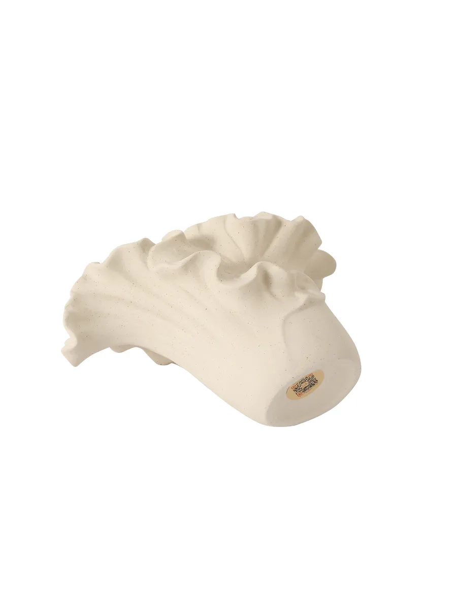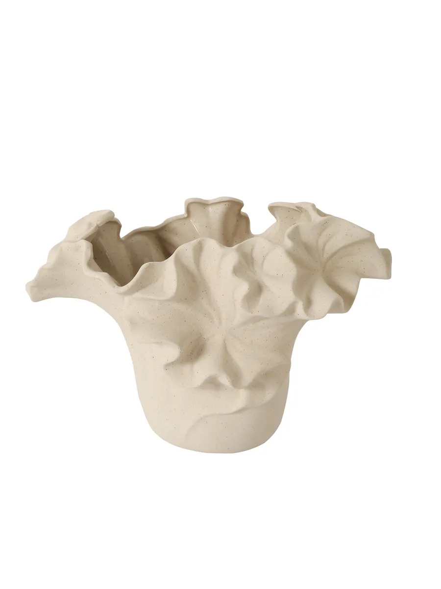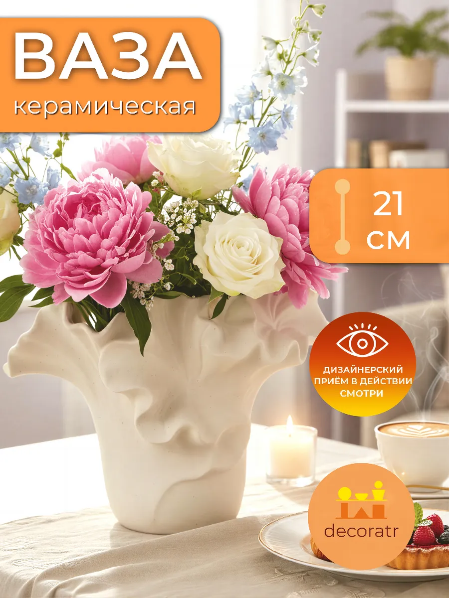 Вот это да! Какая невероятная форма! Горловина вазы напоминает распустившийся цветок лотоса с изящно изогнутыми лепестками, которые создают неповторимую игру света и тени. Матовая керамическая поверхность приятна на ощупь и излучает спокойствие теплого бежевого оттенка.