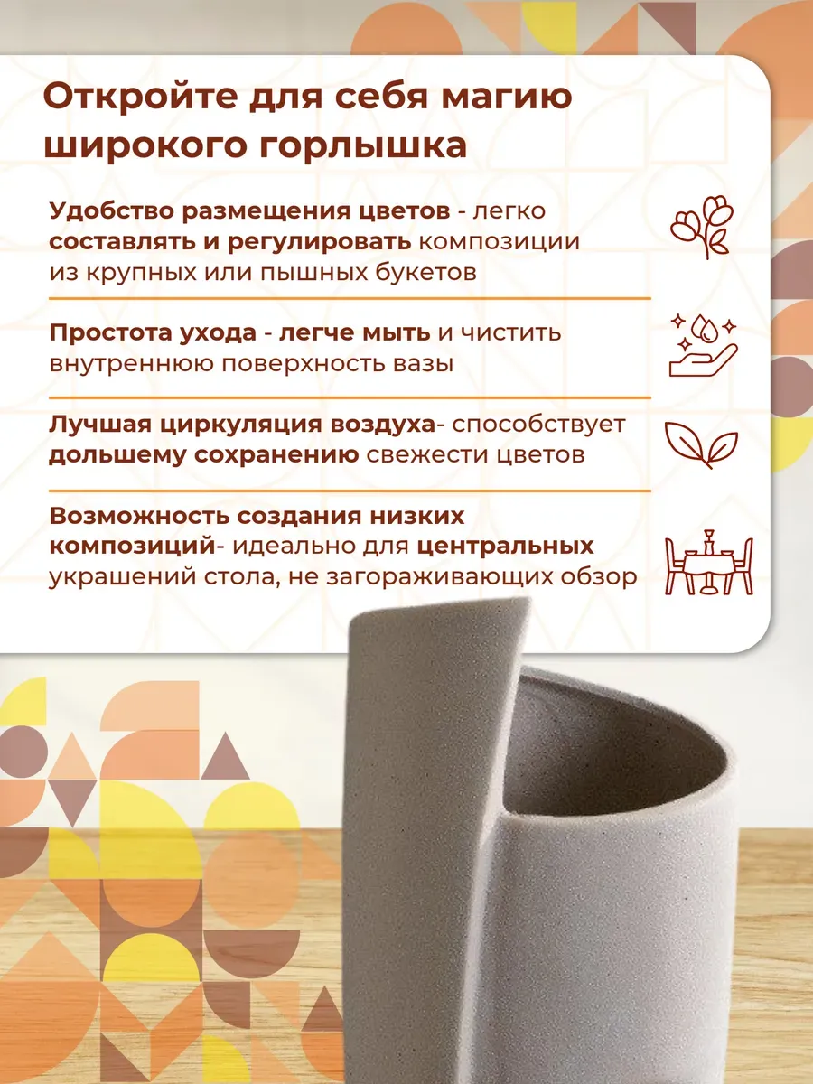 В вашем доме эта ваза керамическая настольная станет точкой притяжения — на журнальном столике в гостиной, на консоли в прихожей или на комоде в спальне. Представьте утренний свет, играющий на матовой поверхности, пока свежие цветы наполняют комнату ароматом весны!