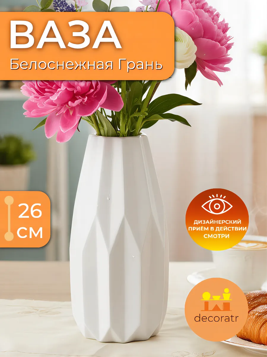 Представьте, как эта изысканная белая красавица высотой 26 см преобразит ваше пространство! Ваза «Снежная грань» — керамическая интерьерная ваза для цветов с уникальным геометрическим рельефом, которая словно высечена из белоснежного мрамора искусным скульптором.