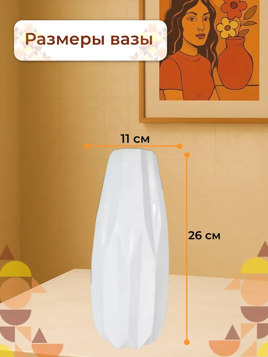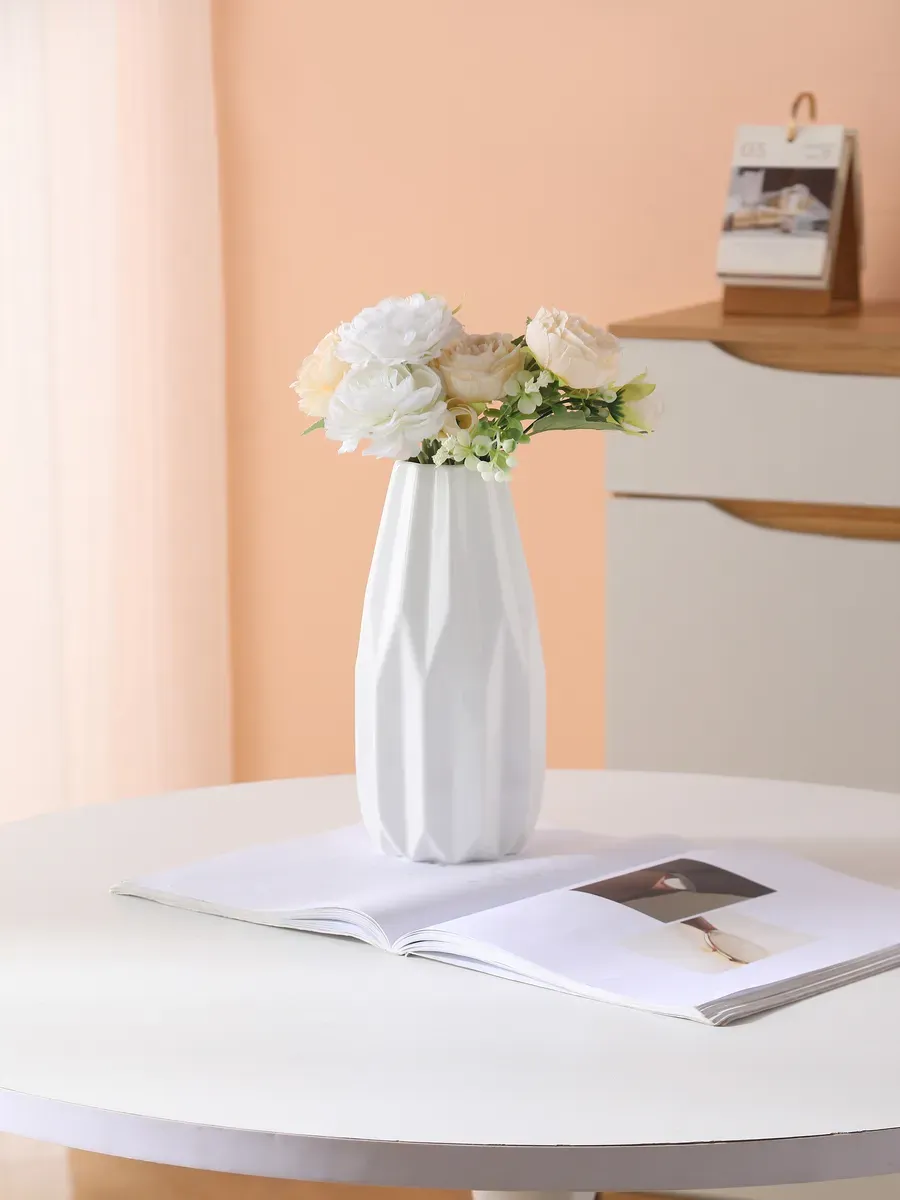 Эта напольная ваза для цветов идеально подходит для букетов роз, пионов, хризантем или изящных веток сухоцветов. Представьте, как солнечные лучи скользят по белоснежной поверхности, создавая мягкие тени между гранями — это настоящая медитация для глаз!