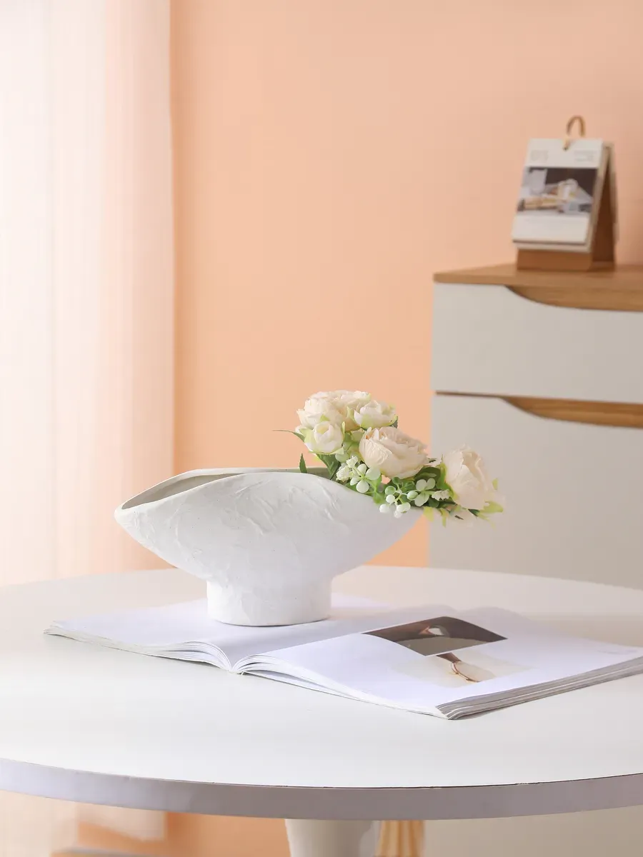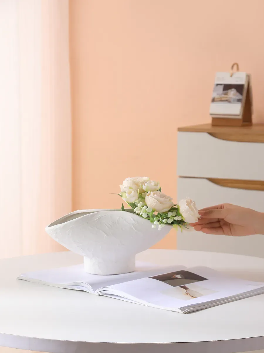 Уникальная овальная форма с плавными изгибами напоминает лунный полумесяц, а нежная белая керамика излучает спокойствие и гармонию. Широкое горлышко идеально подходит для букетов роз, тюльпанов, пионов или элегантных сухоцветов — каждая композиция будет выглядеть как произведение искусства!