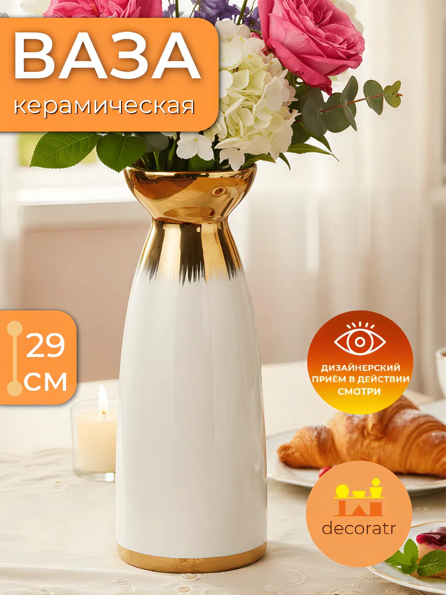 Представьте, как солнечные блики играют на золотой поверхности, а белоснежная керамика отражает свет, создавая атмосферу праздника прямо в вашей гостиной! Ваза «Золотой шик» высотой 29 см — это не просто декоративная ваза для цветов, это настоящее произведение искусства, которое превратит любой букет в королевскую композицию.