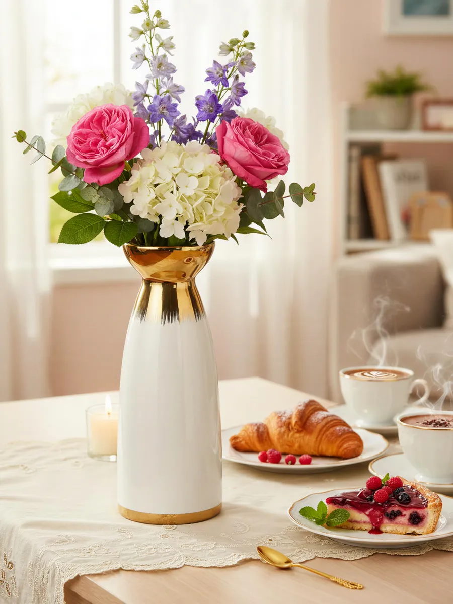 Эксперт по интерьерному дизайну Марина Волкова отмечает: «Вазы с золотыми акцентами — это классика, которая никогда не выходит из моды. Такая ваза для декора создает фокусную точку в комнате и мгновенно повышает статус всего пространства. Рекомендую размещать её на уровне глаз — на консоли, комоде или высокой тумбе».