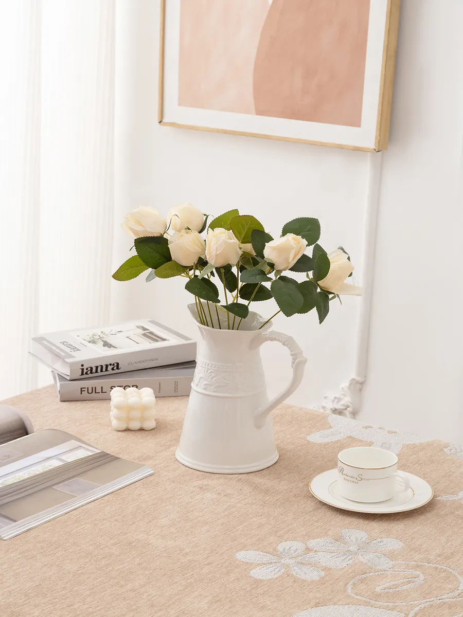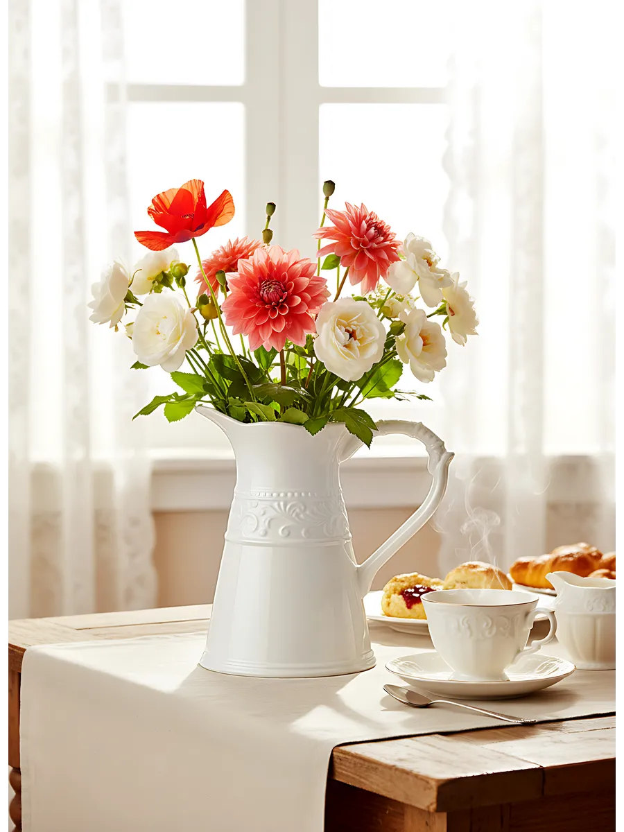 Эта керамическая ваза для дома словно сошла со страниц французского прованса. Её классическая форма кувшина с элегантной ручкой и широким горлышком идеально подходит для букетов из роз, тюльпанов, хризантем или веток сухоцветов. Белая керамика создаёт ощущение чистоты и свежести, а матовая поверхность приятна на ощупь и дарит тактильное наслаждение.