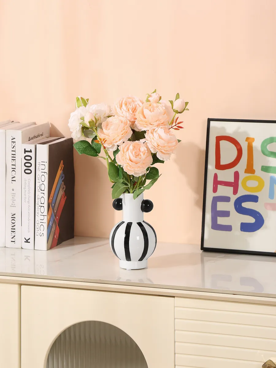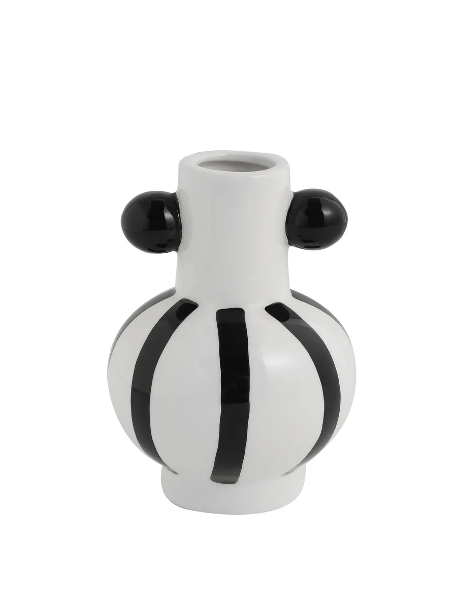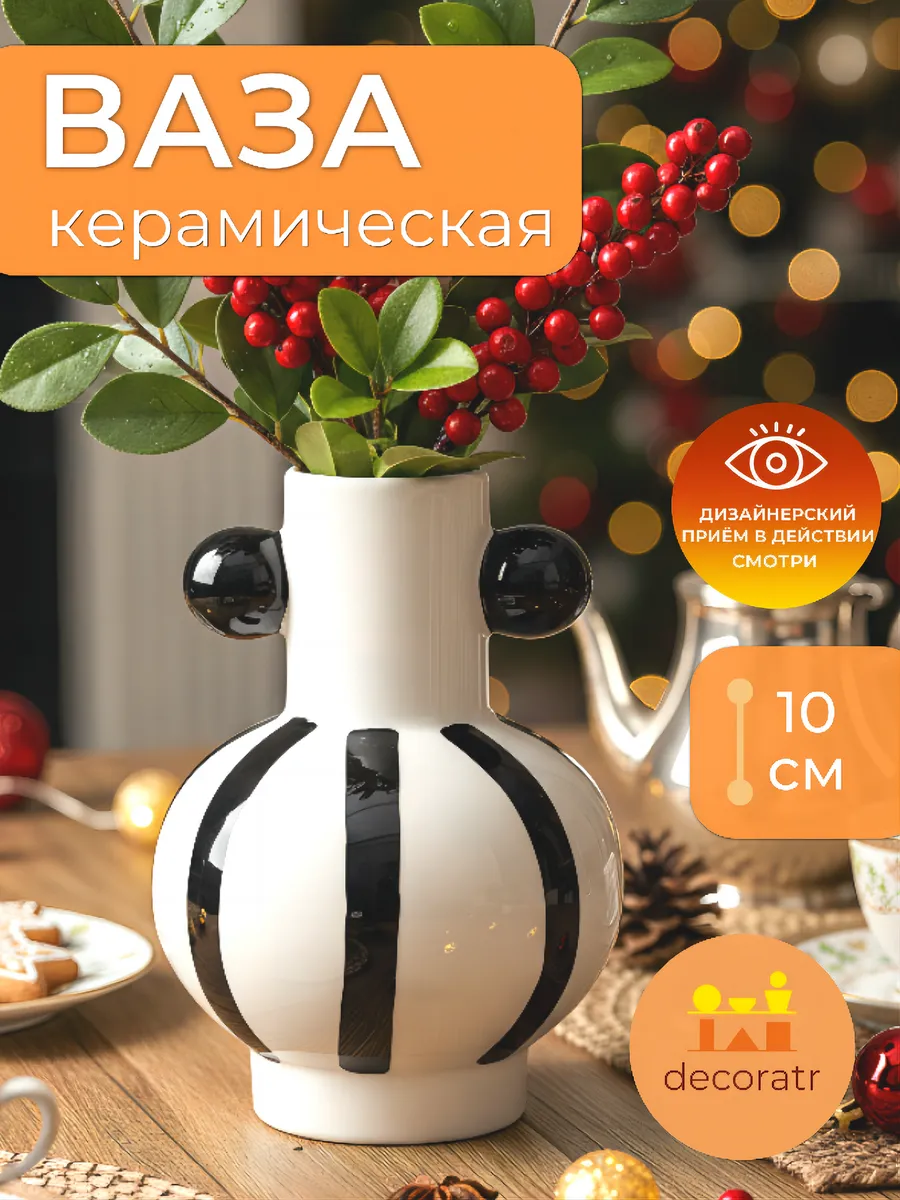 Вот это да! Белоснежная керамика с контрастными чёрными полосами и изящными чёрными шариками создаёт эффект современной скульптуры. Гладкая поверхность приятно холодит ладони, а идеальные пропорции 10×10 см делают эту вазу универсальным решением для любого пространства.
