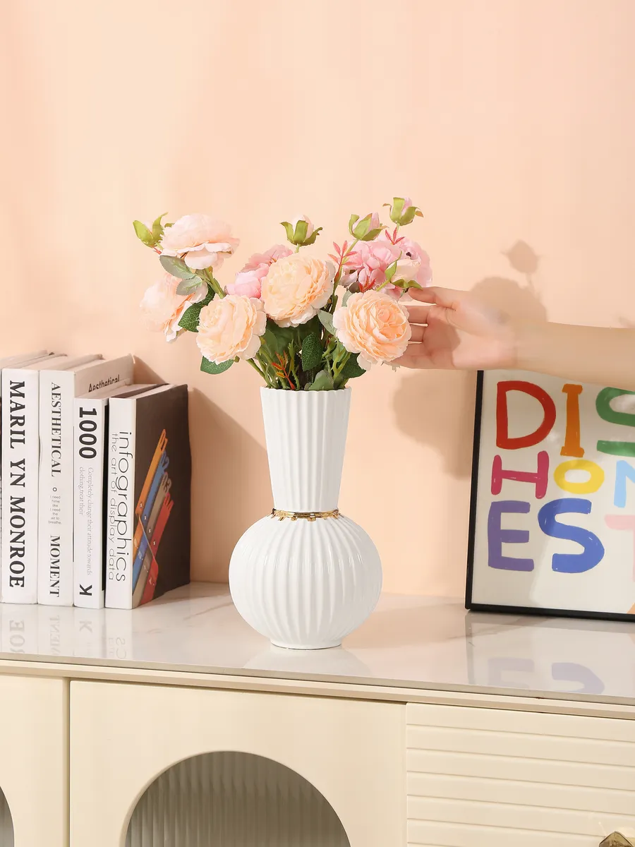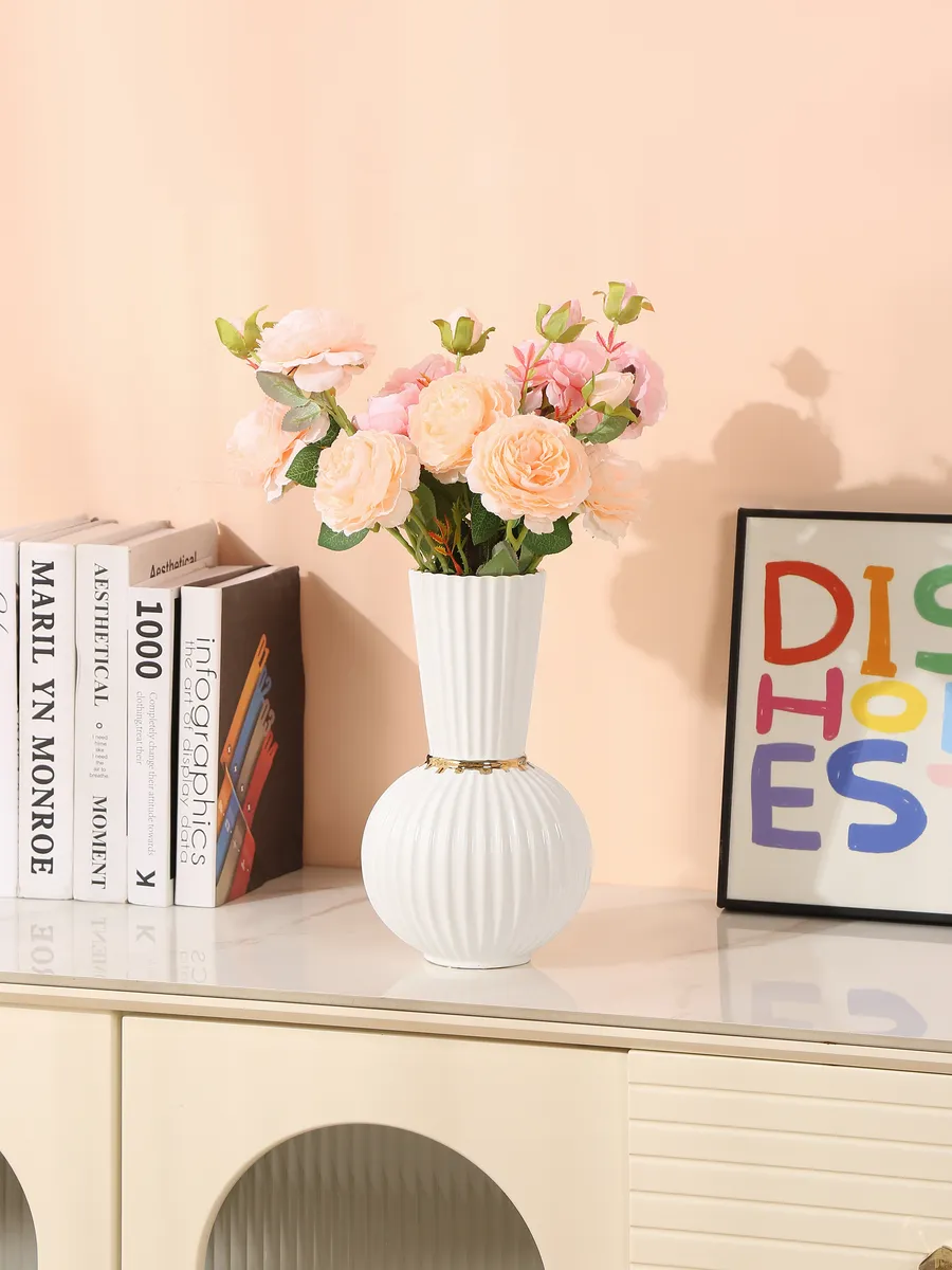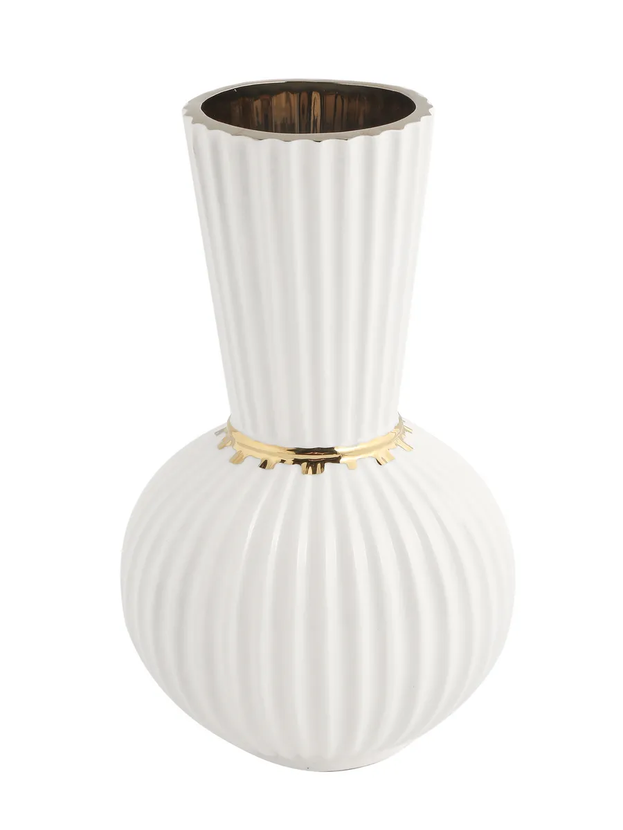 Почувствуйте, как приятно держать в руках эту керамическую красавицу — её округлые формы и нежная белоснежная поверхность словно созданы для того, чтобы подчеркнуть красоту любого букета. Вертикальные рифленые полосы создают игру света и тени, а тонкая золотистая полоска посередине добавляет нотку роскоши.