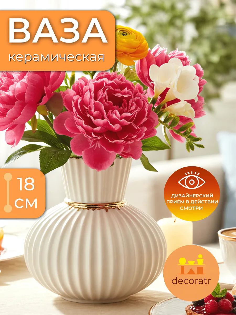 Ваза керамическая в виде кувшина, невысокая и средняя, высота 18 см, настольная, глянцевая и непрозрачная, с золотым ободком. Ваза керамическая для цветов белая рифленая 18 см — украшение интерьера! Представьте, как ваш дом преображается одним изящным штрихом! Ваза «Снежная Гармония» высотой 18 см — это керамическая интерьерная ваза для цветов, которая станет настоящей жемчужиной вашего…