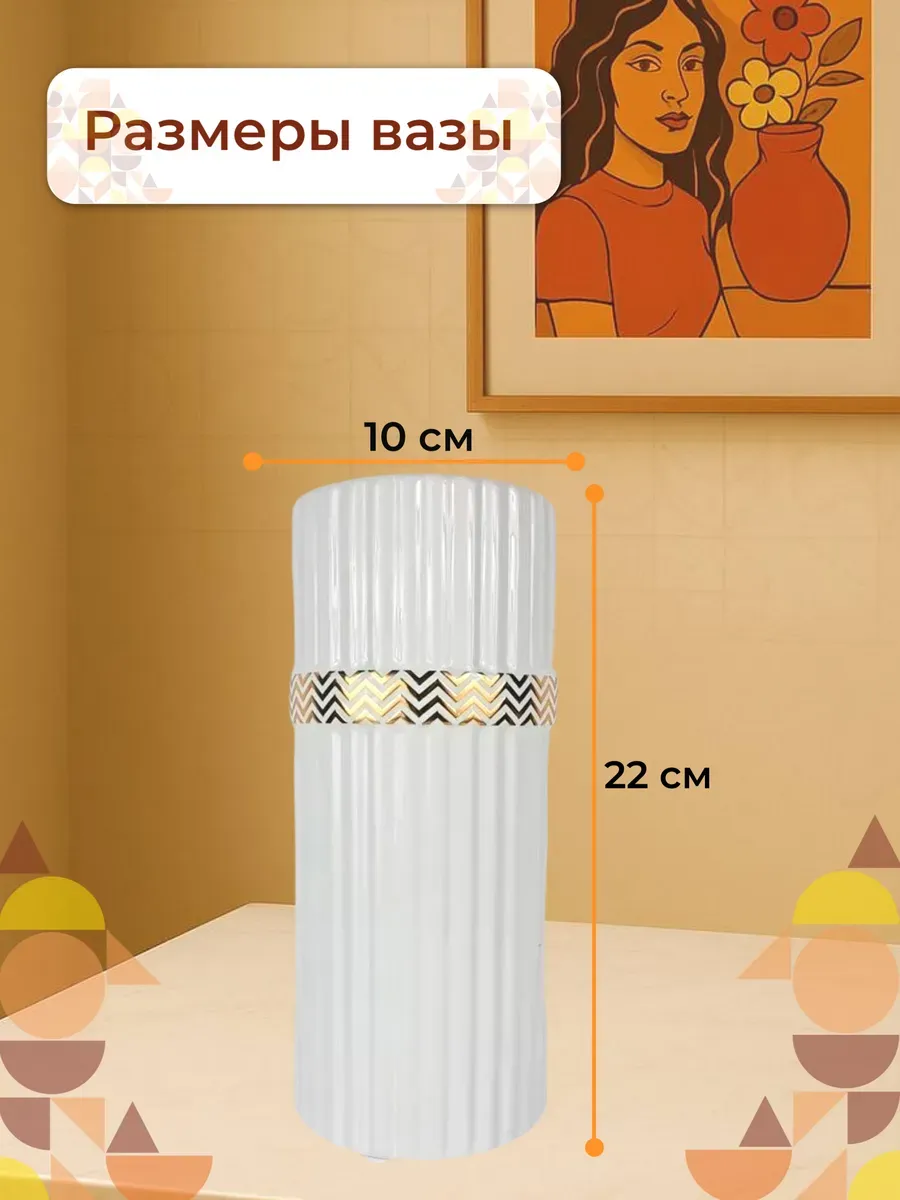 Ваза керамическая белая узкая, высокая и большая, высота 22 см, настольная, глянцевая и непрозрачная, с золотым ободком. Керамическая ваза для цветов с геометрическим орнаментом — белая интерьерная ваза 22 см! Представьте, как эта изящная белоснежная красавица высотой 22 см преображает ваш дом одним своим присутствием! Ваза «Белый шарм» — это керамическая интерьерная ваза для цветов,…