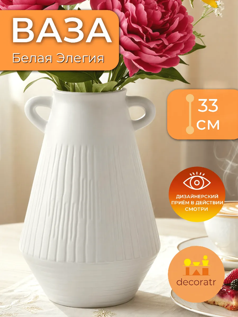 Представьте, как эта изящная белая красавица высотой 20 см станет главной героиней вашего дома! Ваза «Белая Элегия» — керамическая интерьерная ваза для цветов с уникальным рифленым декором и элегантными ручками, которая мгновенно превращает любое пространство в стильную галерею.