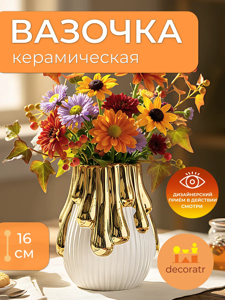 Представьте, как солнечные лучи танцуют на золотых каплях этой изысканной вазы! Ваза «Золотые Слёзы» высотой 16 см — это настоящая керамическая драгоценность, которая превратит любой букет в произведение искусства.
