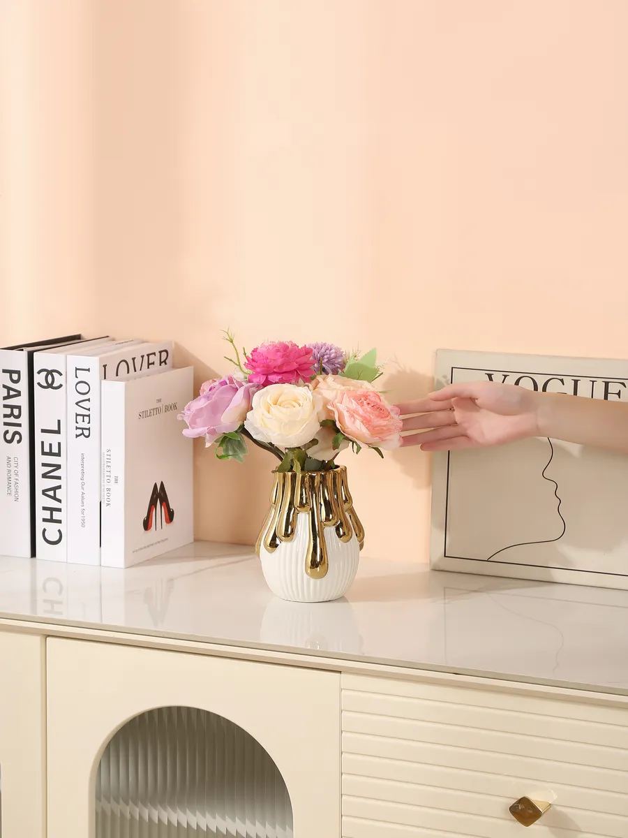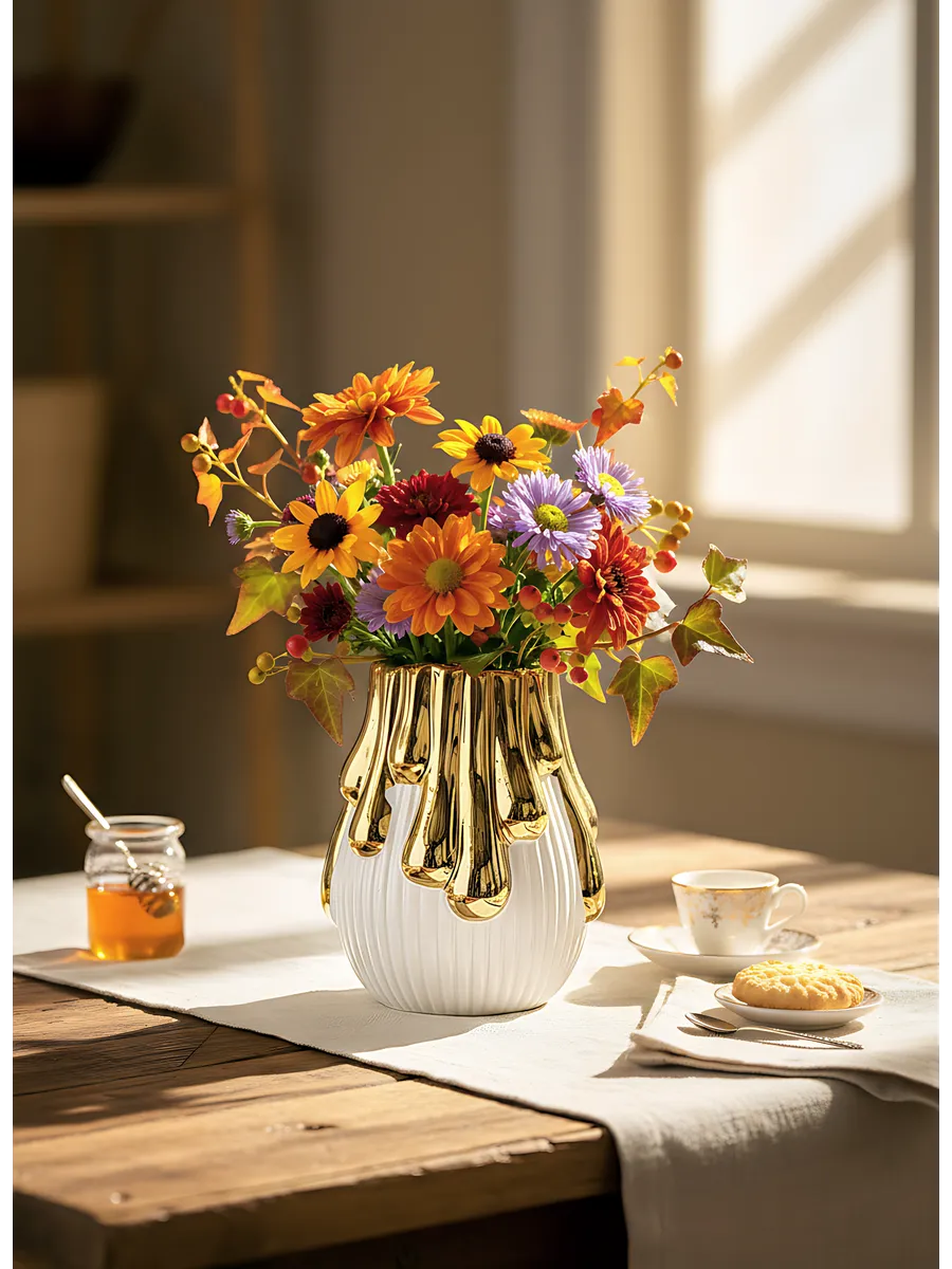 Белоснежная керамика с рифлёной поверхностью словно создана для того, чтобы подчеркнуть красоту каждого лепестка. А золотые подтёки, стекающие с верхнего края, напоминают капли мёда или расплавленного солнца — они добавляют нотку роскоши и делают эту интерьерную вазу поистине уникальной!