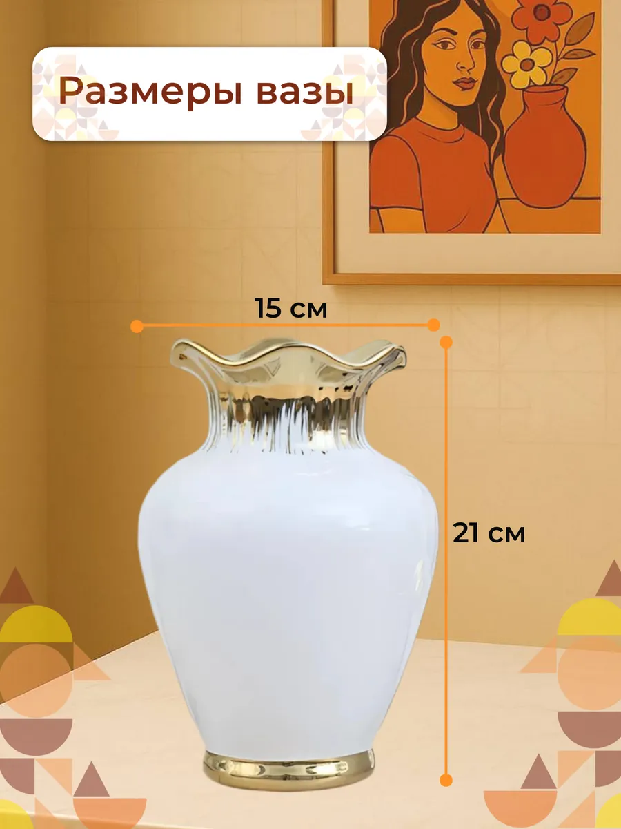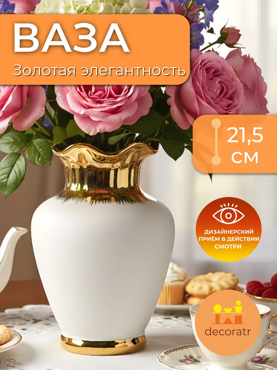 Керамическая ваза белая с золотом станет центральным элементом гостиной, спальни или кабинета. Она идеально вписывается в стиль арт-деко и классический интерьер, добавляя изысканности и благородства. Холодная гладкость керамики приятно контрастирует с тёплым блеском золотого декора — настоящее удовольствие для глаз и рук!