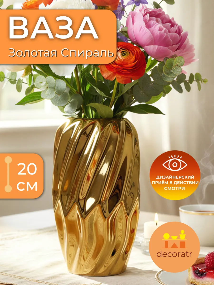 Ваза «Золотая Спираль» — это не просто керамическая ваза для дома, это настоящее произведение искусства, которое мгновенно преображает любое пространство.