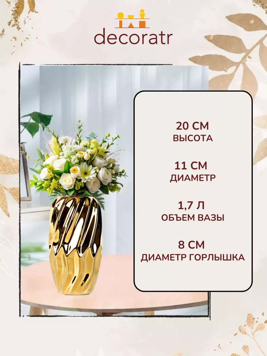 Практичность в деталях! Керамическая основа с глазурованным покрытием легко моется — просто протрите влажной салфеткой. Устойчивое дно гарантирует, что ваш букет останется на месте даже при случайном касании. А универсальный золотой оттенок гармонирует с любой цветовой гаммой интерьера.