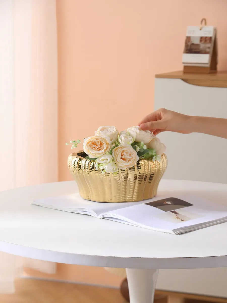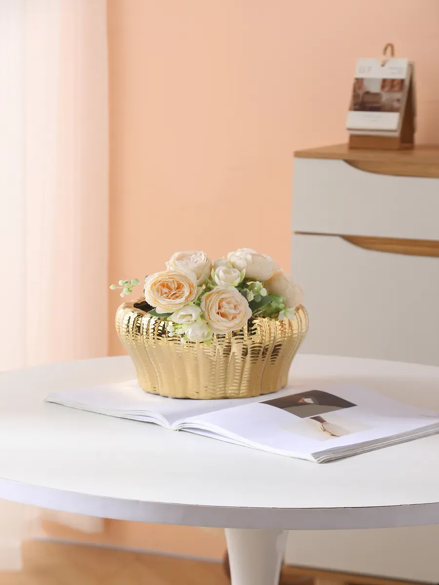 Представьте, как ваш интерьер преображается от одного взгляда на эту великолепную керамическую вазу высотой 20 см! Ваза «Золотая Корзина» — это не просто декоративная ваза для цветов, а настоящий арт-объект, который превращает обычную комнату в изысканное пространство.