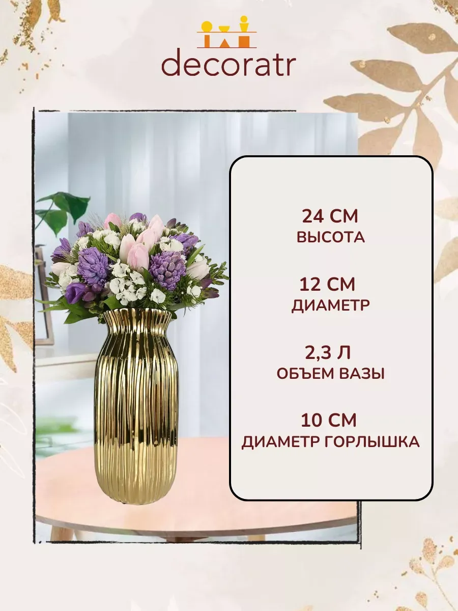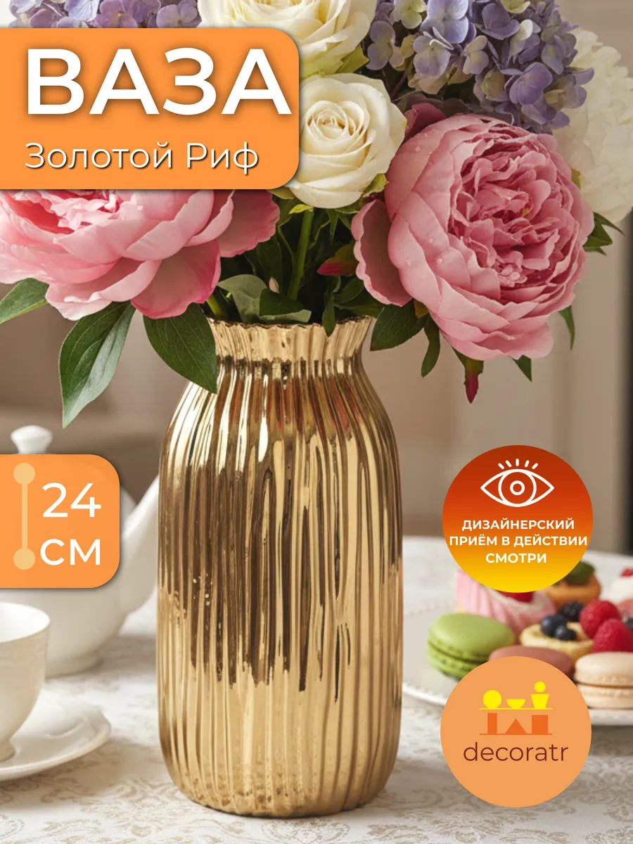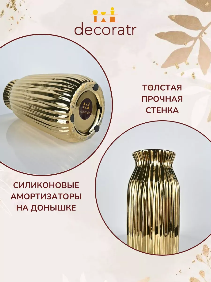Представьте, как солнечный свет играет на золотистой поверхности этой великолепной вазы высотой 24 см, создавая в вашем доме атмосферу роскоши и уюта! Ваза «Золотой Риф» — керамическая интерьерная ваза для цветов, которая мгновенно превращает любое пространство в изысканную галерею.