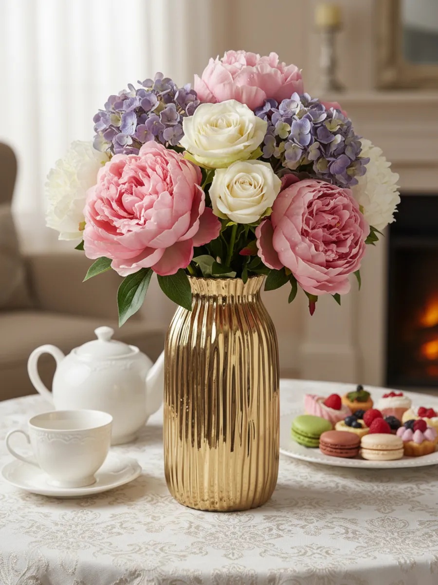 Эта декоративная ваза для дома идеально подходит для букетов роз, пионов, хризантем, подсолнухов и сухоцветов. Широкое горлышко позволяет создавать пышные композиции, а устойчивое дно гарантирует безопасность даже самых объёмных букетов.