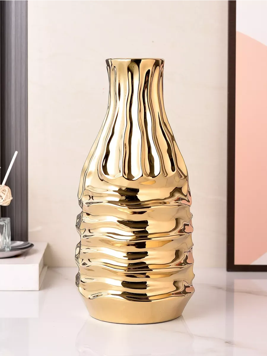 Представьте, как солнечные лучи танцуют на золотистой поверхности этой удивительной вазы высотой 30,5 см! Ваза «Золотой поток» — керамическая интерьерная ваза для цветов, которая превратит ваш дом в настоящую галерею искусства. Вот это да! Именно то, что нужно для создания атмосферы роскоши и изысканности!