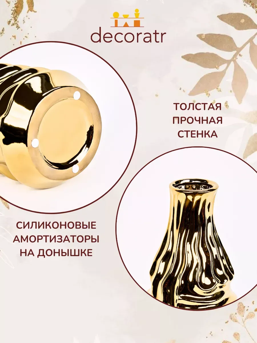 Керамическая ваза золотая легко моется, устойчива к царапинам и сохраняет блеск долгие годы. Её широкое основание гарантирует устойчивость — даже самый пышный букет не опрокинет эту красавицу!