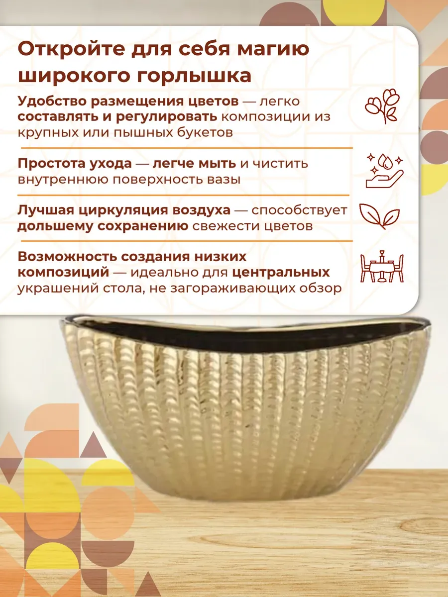 Представьте, как этот маленький золотистый шедевр преобразит ваш дом! Ваза «Солнечный луч» высотой 12 см — это настоящая находка для тех, кто ценит изысканность в каждой детали интерьера.