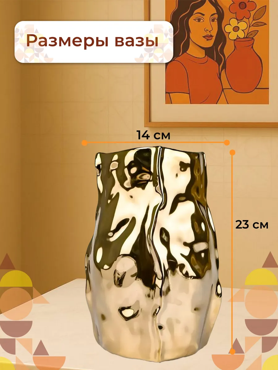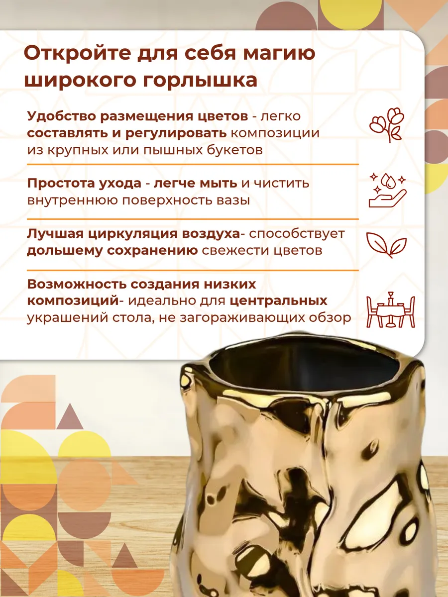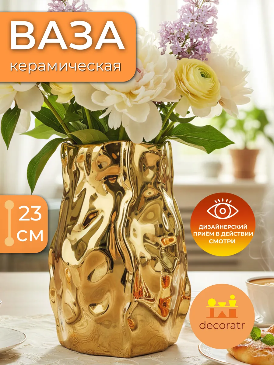 Эта керамическая ваза для дома создана для тех, кто понимает истинную ценность красоты! Золотистое покрытие переливается тысячами бликов, создавая атмосферу роскоши и тепла в любом пространстве. Неправильная, словно выточенная самой природой форма делает каждый угол обзора неповторимым — настоящее произведение искусства у вас дома!