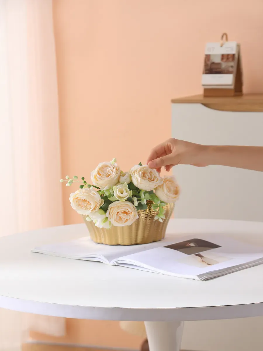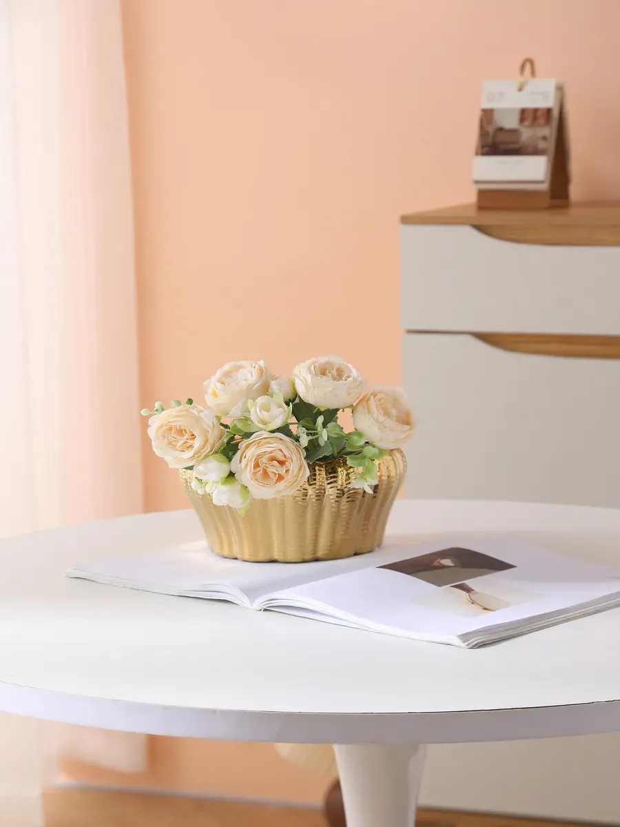 Компактные размеры 19×16 см делают её идеальной для небольших букетов роз, тюльпанов или веточек эвкалипта. Представьте, как нежные пионы или яркие герберы будут смотреться в этой золотистой оправе! А сухоцветы и декоративные ветки создадут с ней просто волшебный ансамбль.