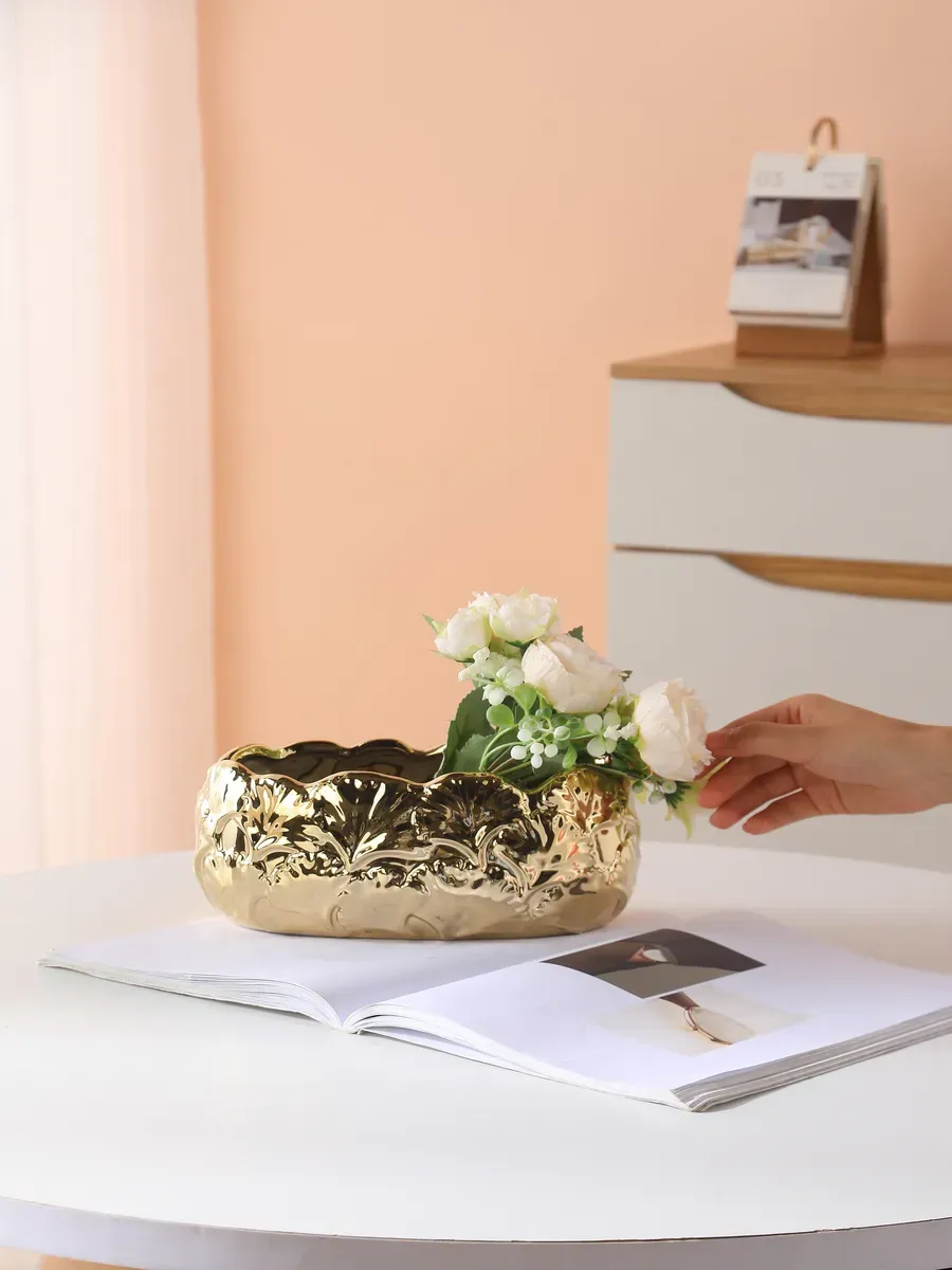 Керамическая ваза золотая выбирается дизайнерами интерьеров для оформления премиальных проектов. Её рекомендуют флористы для создания эксклюзивных композиций на свадьбах и торжественных мероприятиях.
