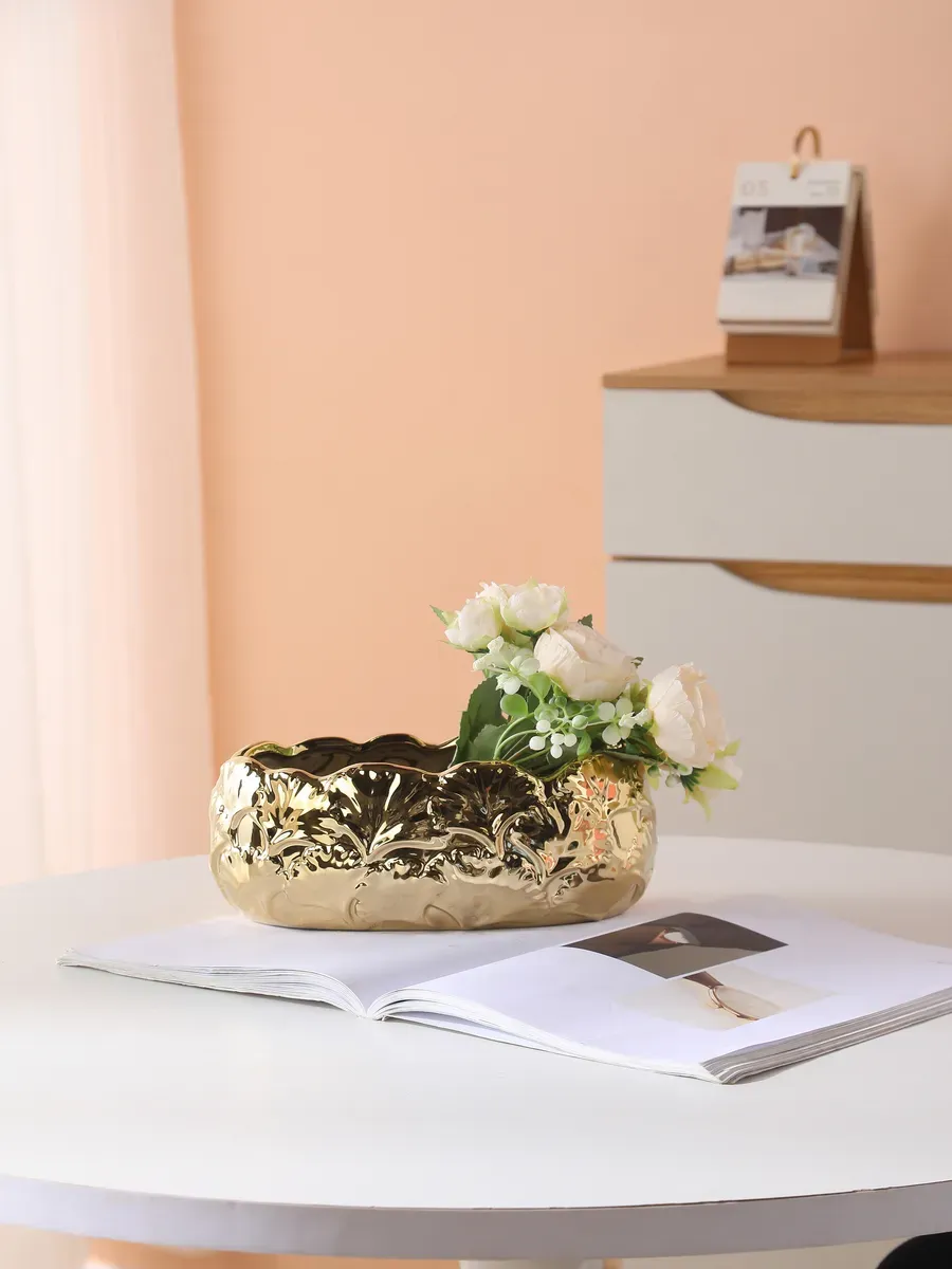 Представьте: солнечные лучи играют на золотистой поверхности, а изысканные цветы словно парят в воздухе! Ваза «Золотая Волна» высотой 10 см — это настоящее произведение искусства, которое мгновенно преобразит любой уголок вашего дома.