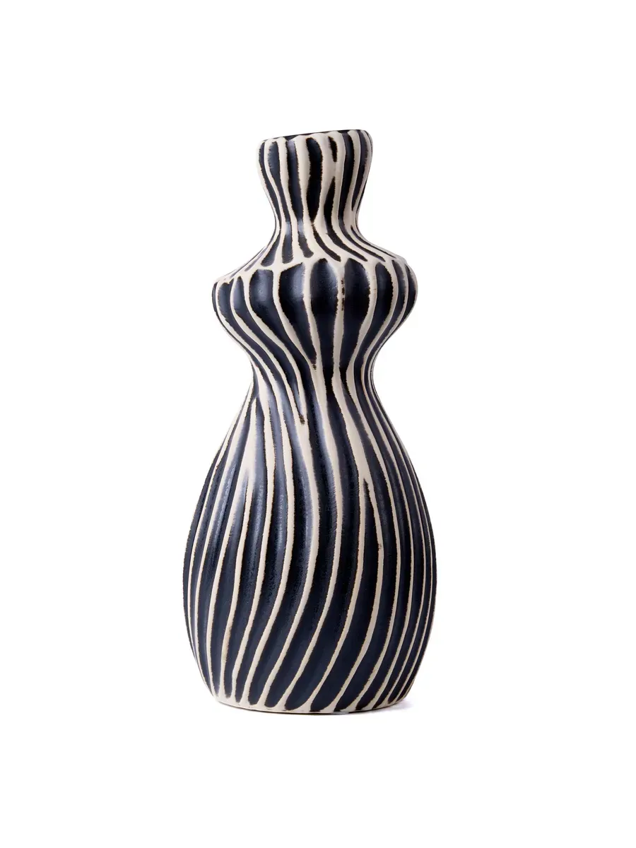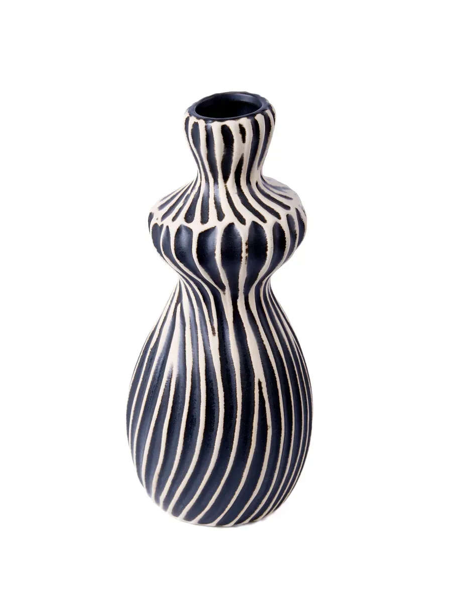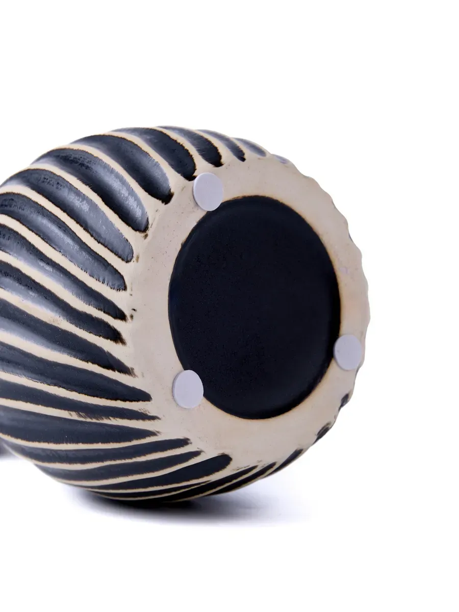 Ваза керамическая с ребристой поверхностью, высокая и средняя, высота 25,5 см, настольная, глянцевая и непрозрачная, с рисунком.