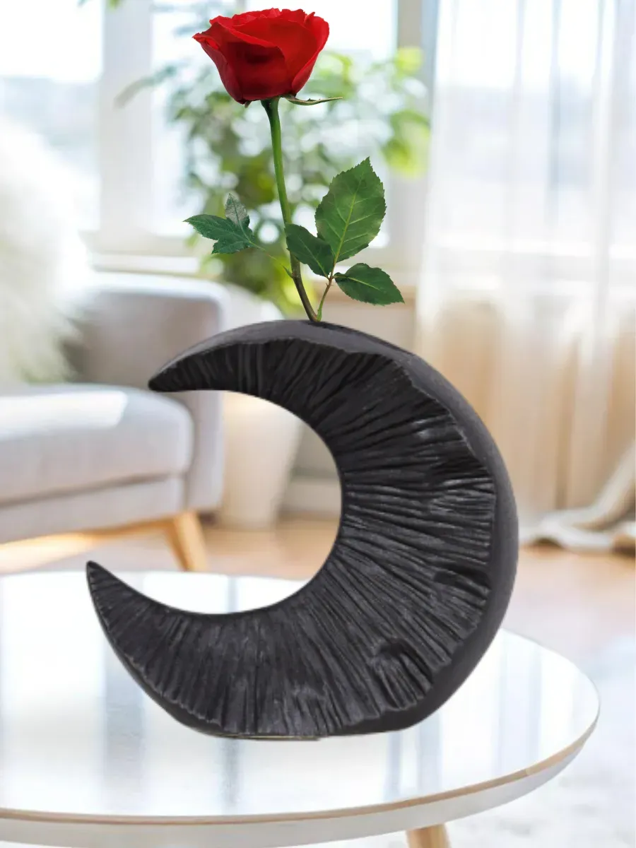 Ваза керамическая в виде месяца, невысокая и средняя, высота 17 см, настольная, матовая и непрозрачная, без декора.