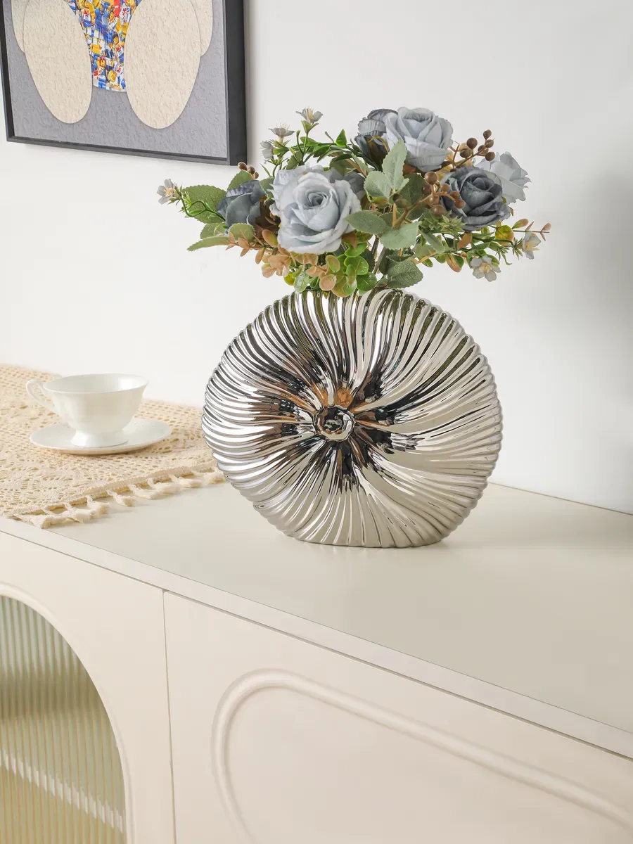 Благородный серебристый оттенок с металлическим блеском придаёт этой интерьерной вазе поистине королевский вид. Каждая линия, каждый изгиб продуман до мелочей — от центрального углубления до изящно расходящихся рёбер, которые напоминают лепестки диковинного цветка.
