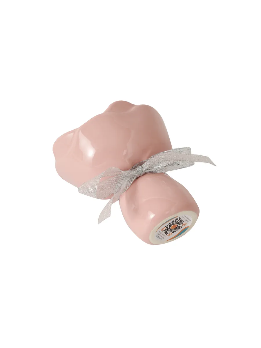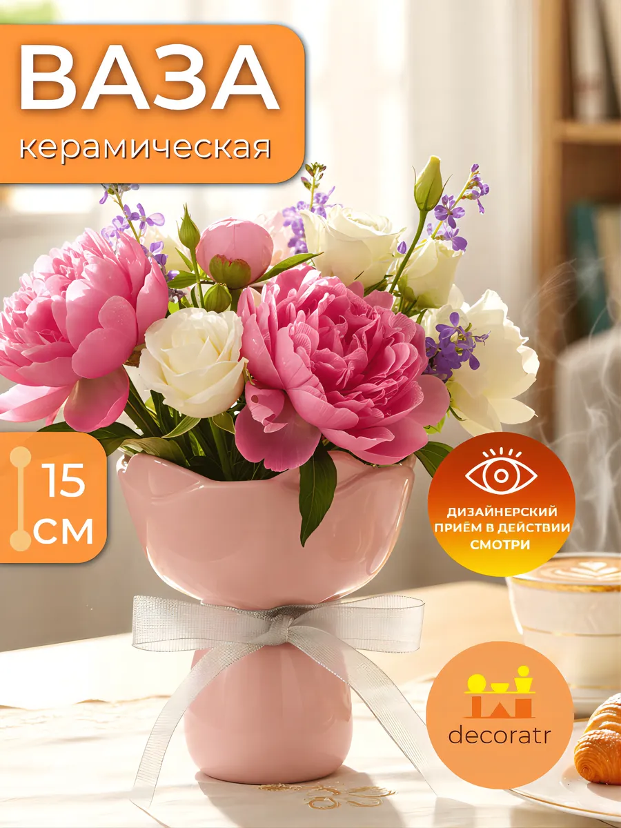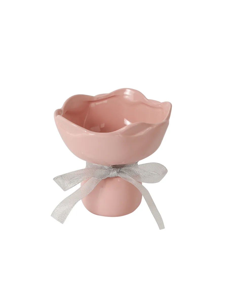 Ваза керамическая розовая в виде букета, низкая и маленькая, высота 15 см, настольная, глянцевая и непрозрачная, с бантом.
