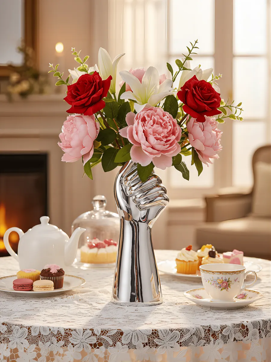 Наш главный декоратор, Мария Северова, советует: «Размещайте вазу-руку на контрастном фоне — тёмная мебель подчеркнёт её серебристый блеск, а светлые поверхности создадут эффект парения в пространстве. Попробуйте поставить рядом свечи — отражения создадут магическую атмосферу!»