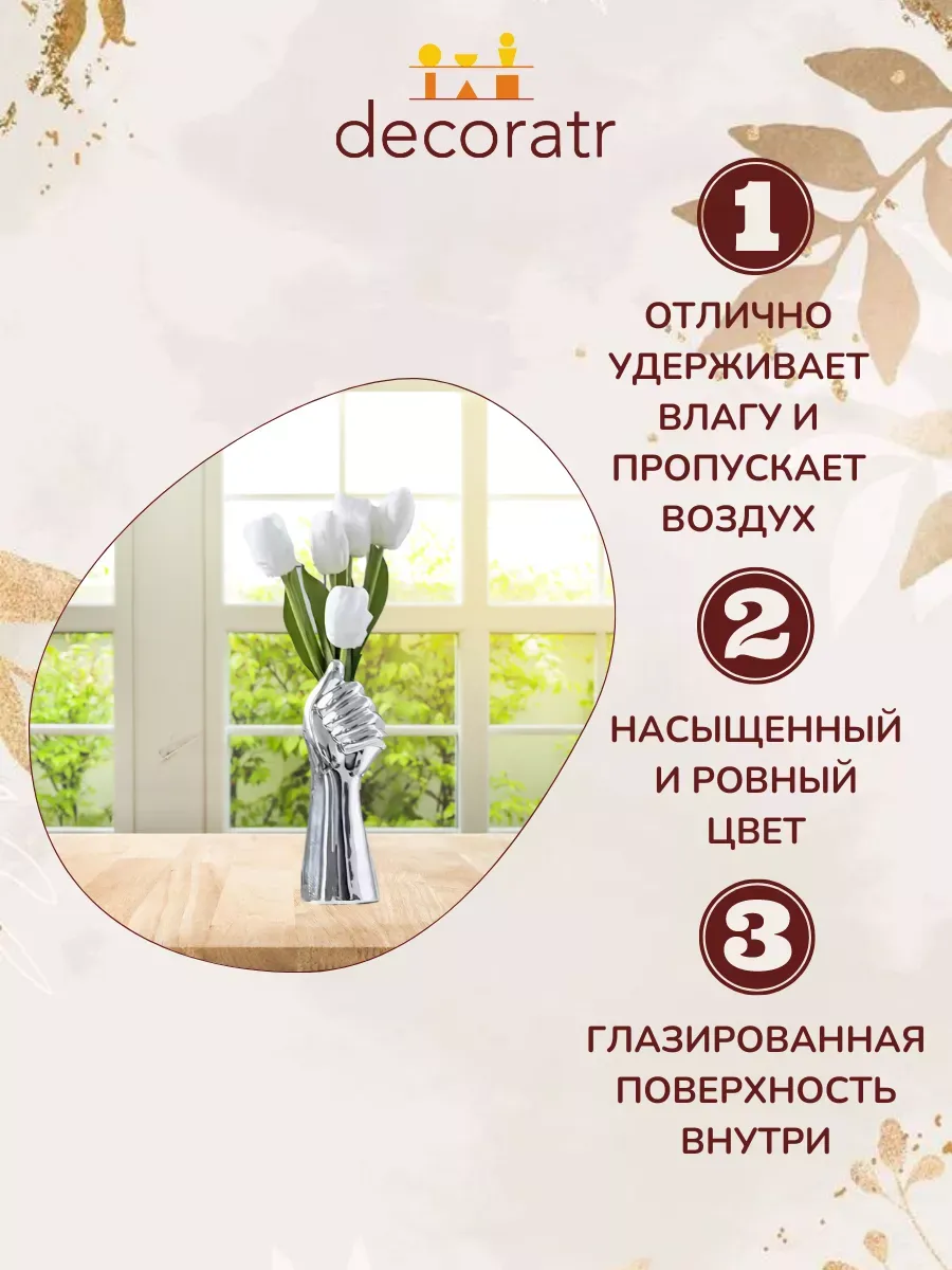 Представьте себе: белоснежные тюльпаны словно вырастают из изящной керамической ладони, создавая невероятно эффектную композицию прямо у вас дома! Ваза «Рука Мидаса» высотой 28 см — это не просто декоративная ваза для цветов, это настоящий арт-объект, который мгновенно преобразит любое пространство.