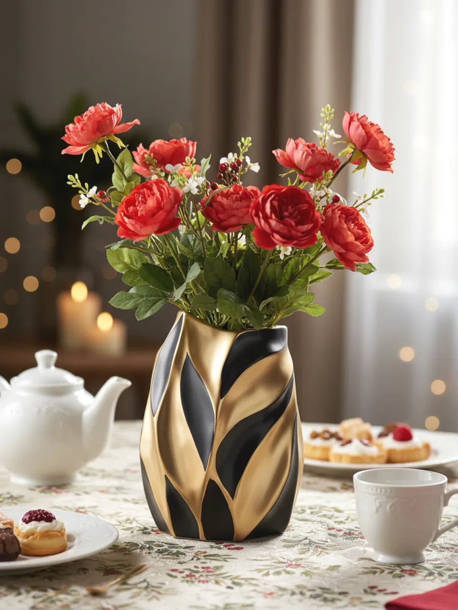 Наш главный декоратор, Елена Морозова, советует: «Размещайте такие вазы на контрастном фоне — тёмная мебель подчеркнёт золотые акценты, а светлая — создаст драматический эффект с чёрными элементами. Попробуйте поставить рядом свечи в чёрных подсвечниках — получится потрясающий ансамбль!»