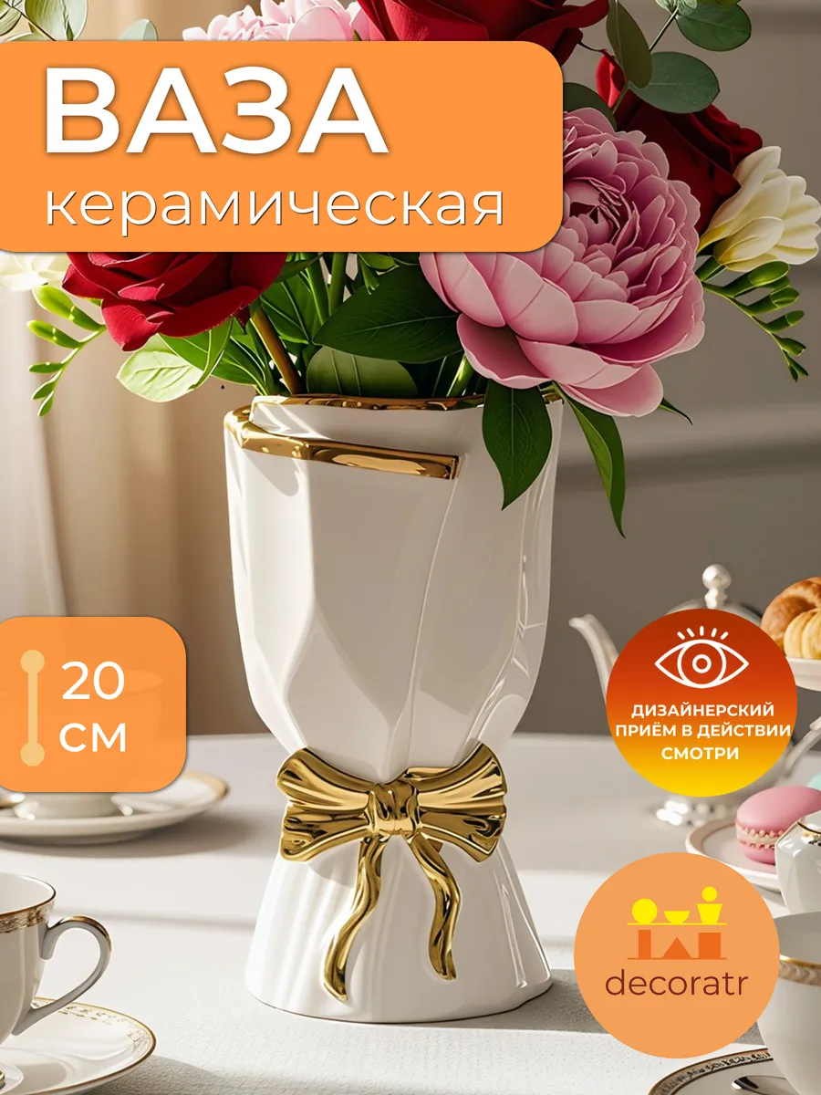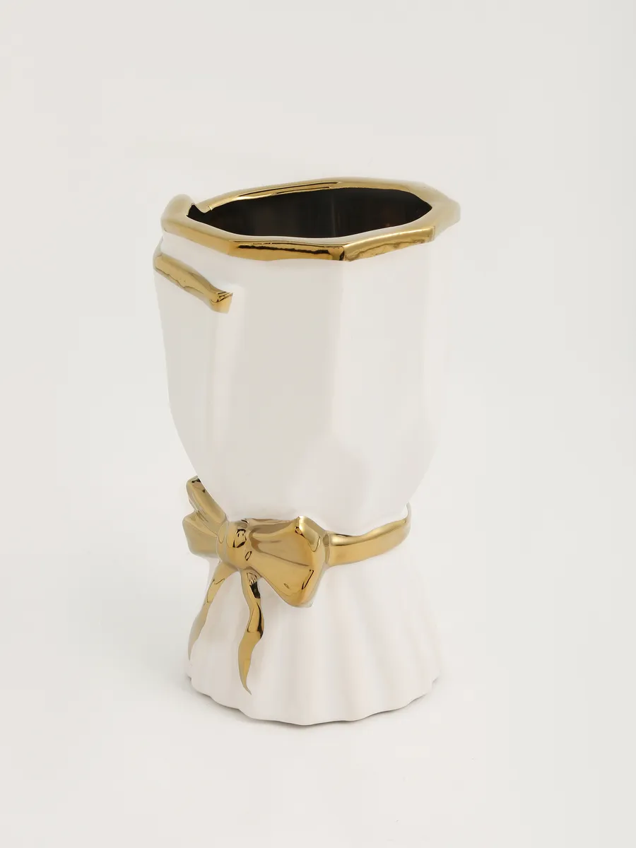Ваза керамическая для цветов с золотым бантом — элегантность в идеальном размере!
