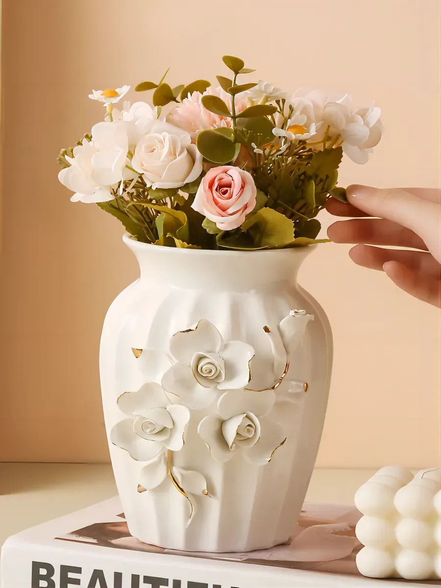 Что за волшебство! Объемные керамические розы будто распускаются прямо на поверхности вазы, создавая удивительную игру света и тени. Каждый лепесток выполнен с такой тщательностью, что хочется дотронуться и убедиться — это действительно керамика, а не живые цветы!