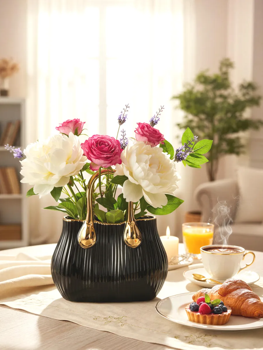 Глубокий черный цвет керамики с роскошными золотыми ручками создает потрясающий контраст, который мгновенно притягивает взгляд. Рифленая поверхность играет со светом, создавая завораживающую игру теней и бликов. Когда солнечные лучи касаются золотых деталей, ваза буквально оживает, наполняя комнату теплым сиянием!