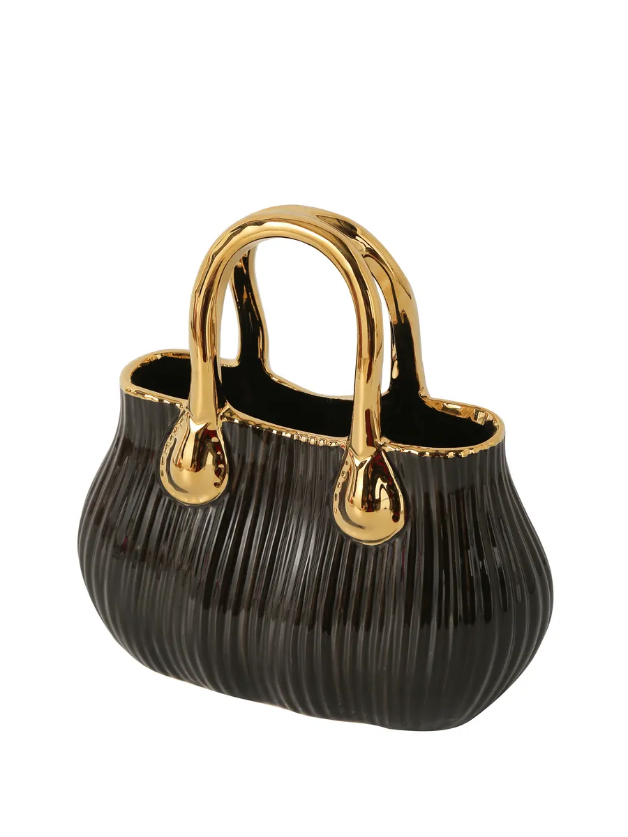 Ваза керамическая в виде сумочки, высокая и средняя, высота 25,5 см, настольная, глянцевая и непрозрачная, с золотыми ручками.